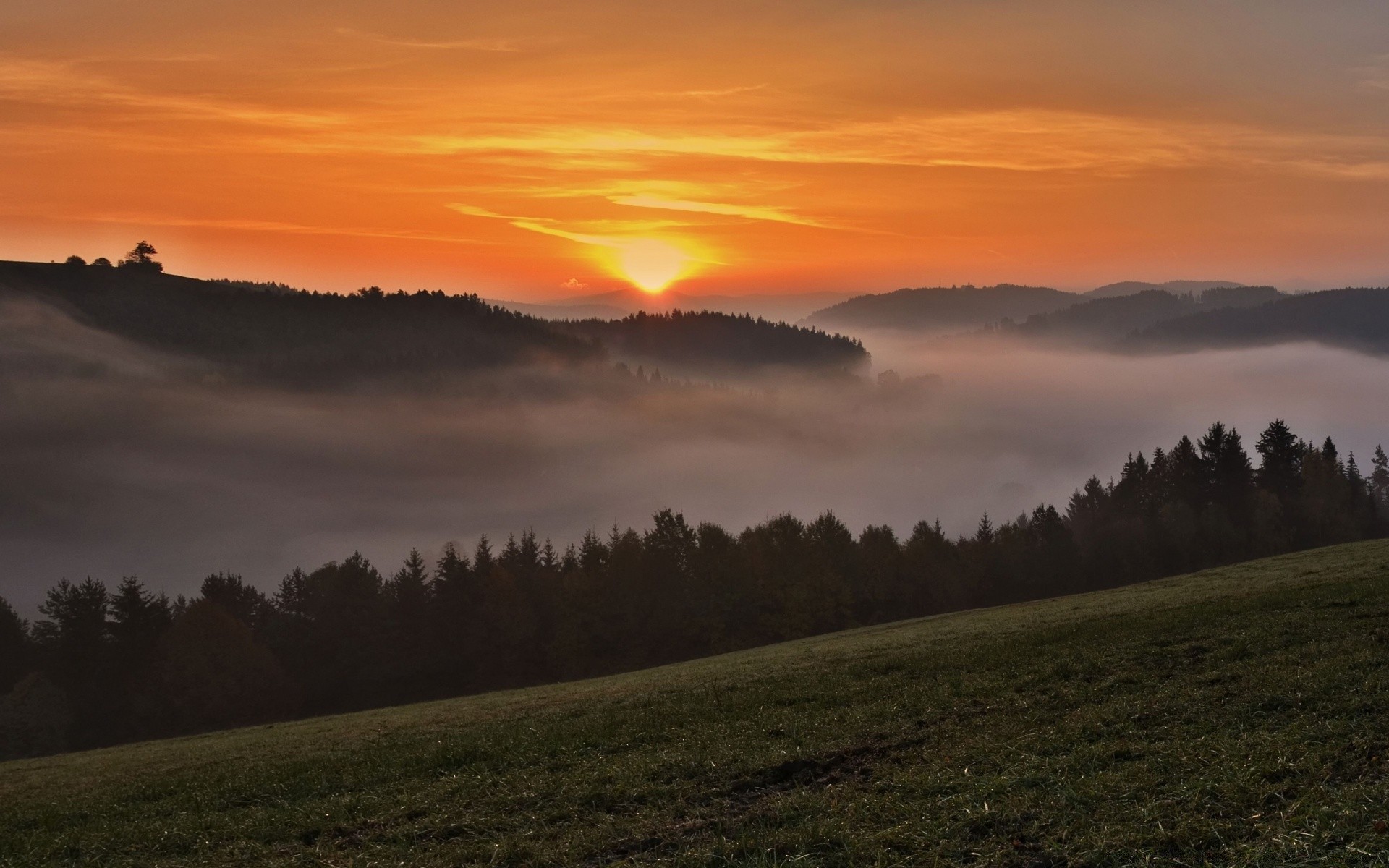 Puesta de sol en las montañas sobre la niebla en el bosque