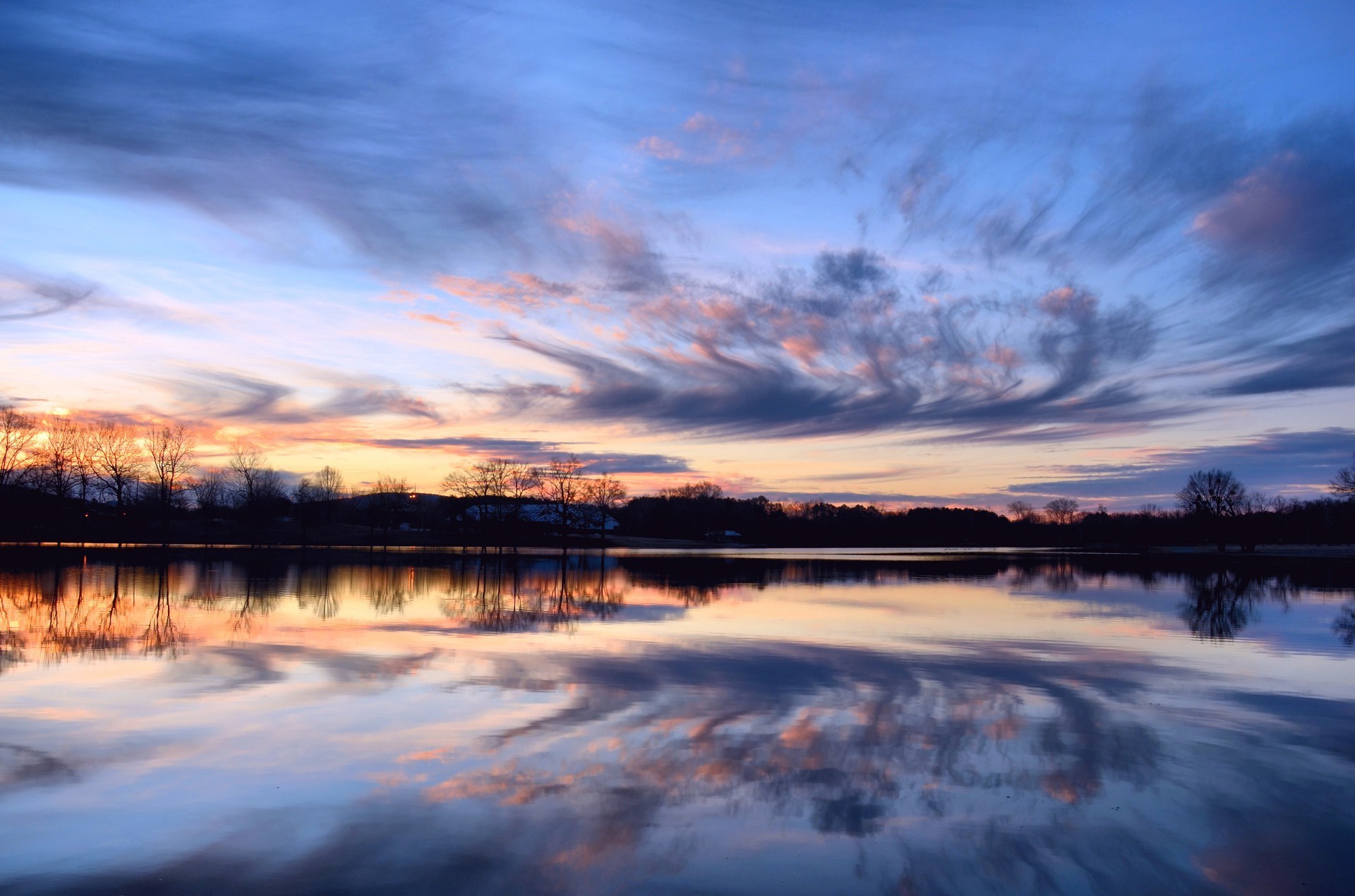 Hermosa puesta de sol a través de las nubes que se refleja en el lago