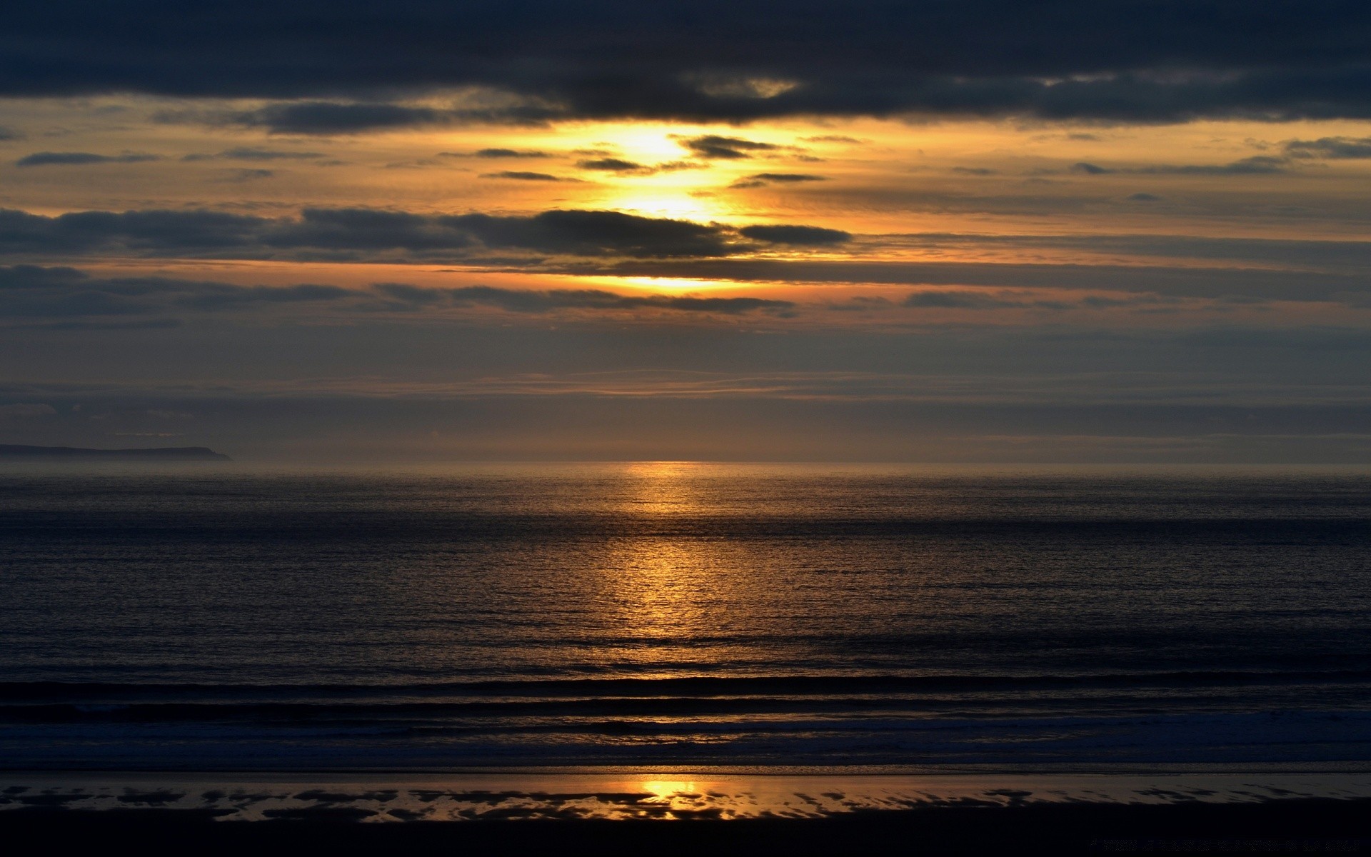 Una puesta de sol de cobre increíblemente encantadora en el mar en calma