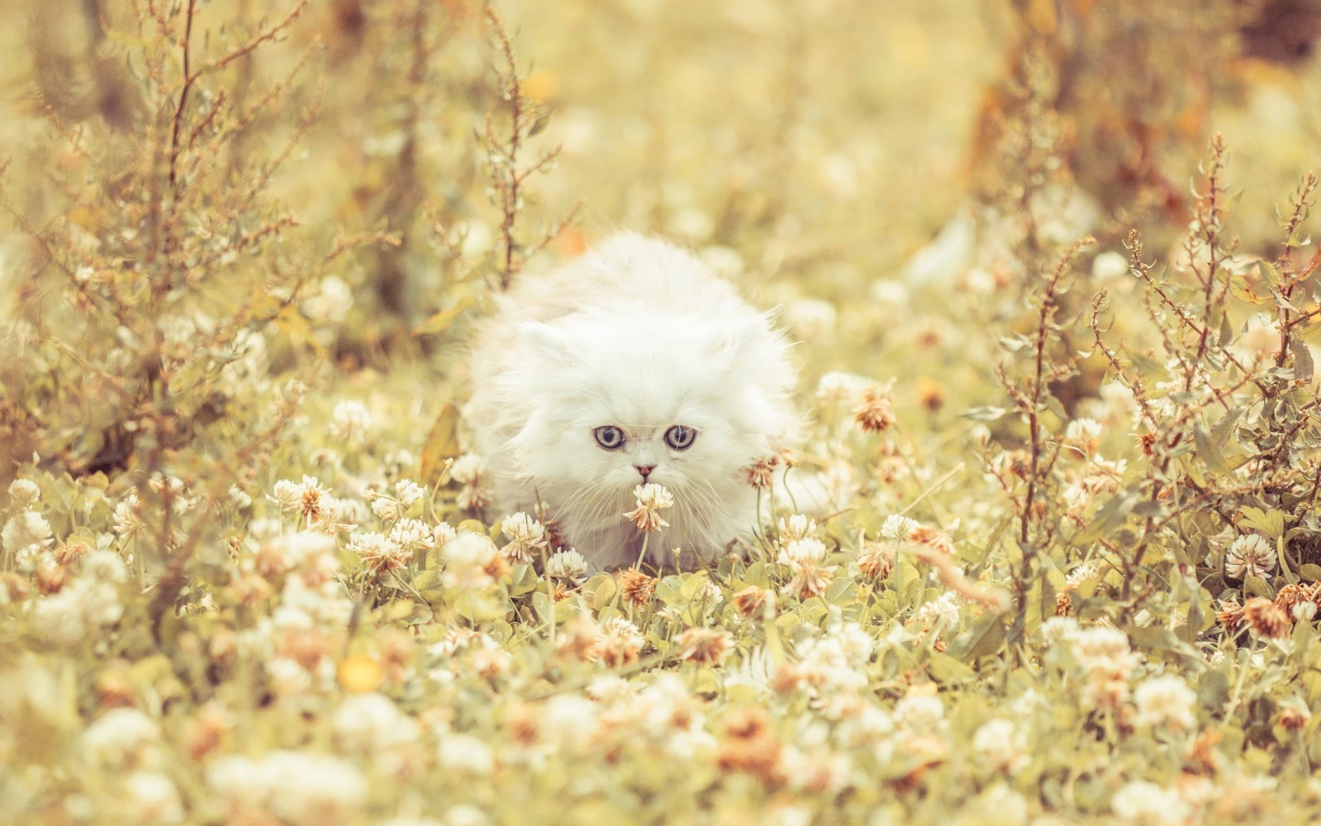 El gatito blanco se sienta en la hierba y te Mira con una mirada llena de frustración