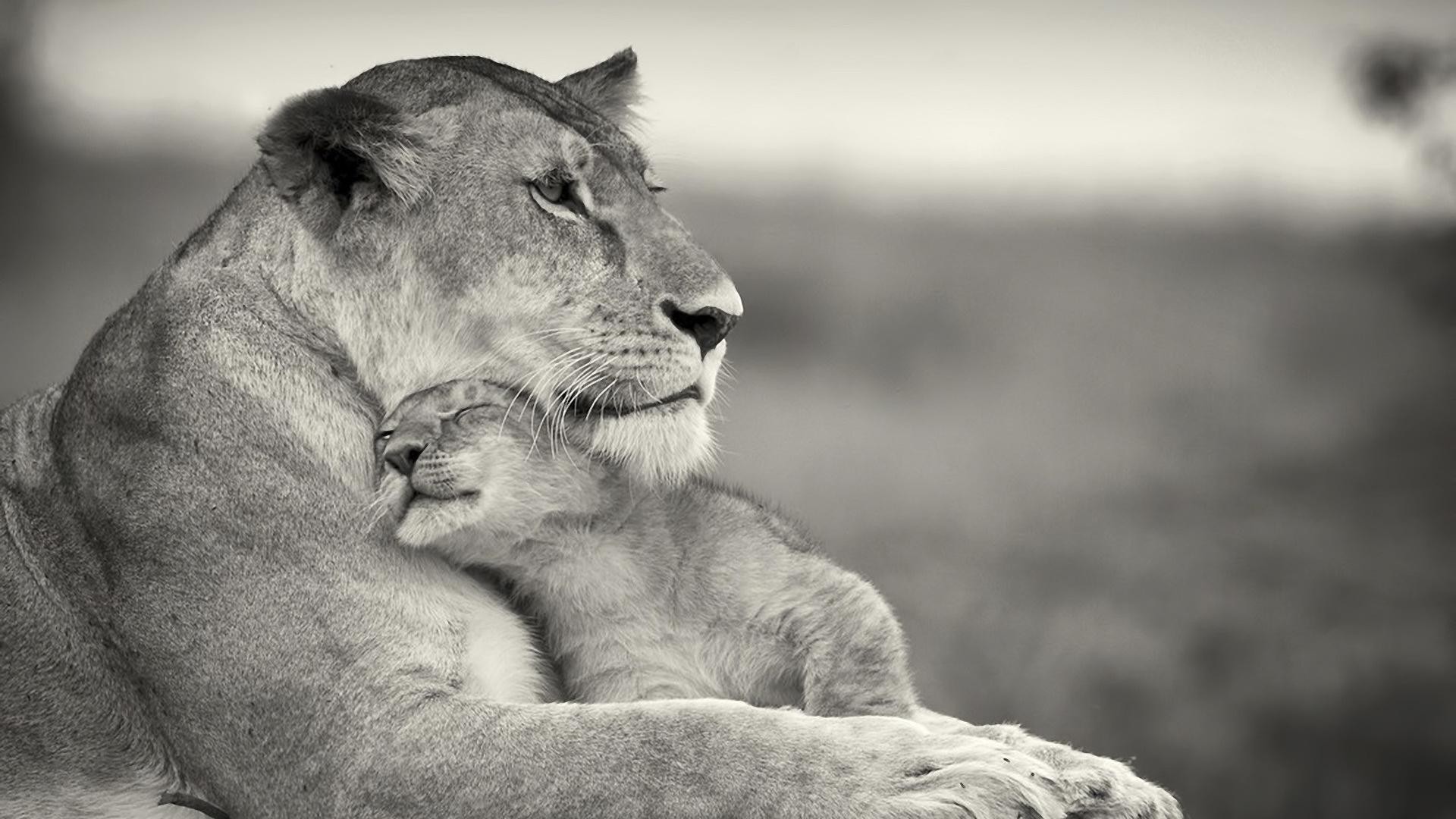Foto en blanco y negro de una Leona y un cachorro en la naturaleza
