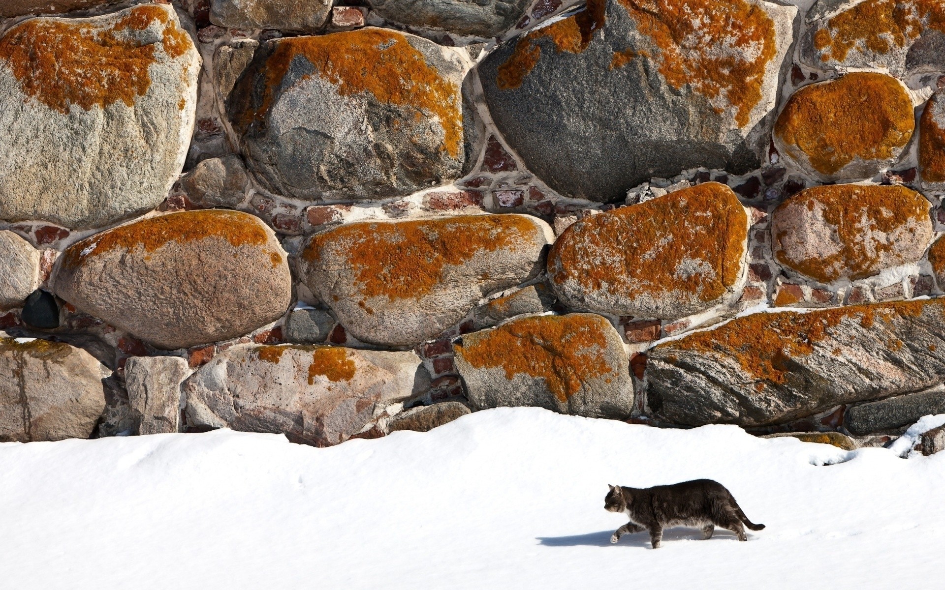 Paisaje nevado con gato y piedras