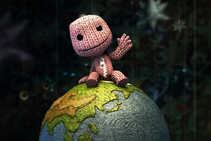 Hombre de punto sentado en el globo de dibujos animadosHombre de punto sentado en el globo de dibujos animados