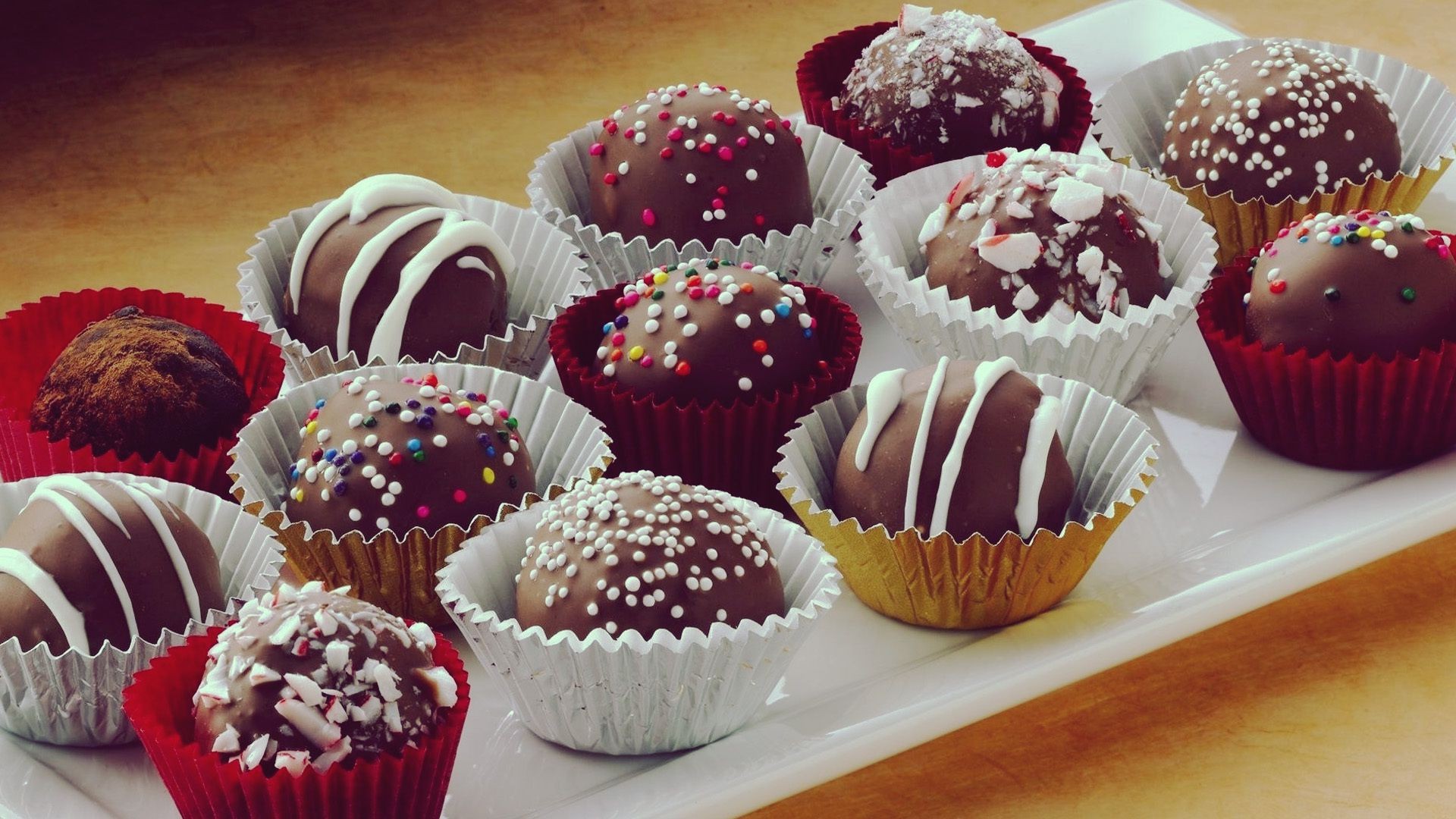 Galletas surtidas, en chocolate blanco y negro, espolvoreadas con nueces con mermelada agregada. En forma de flores y pretzels