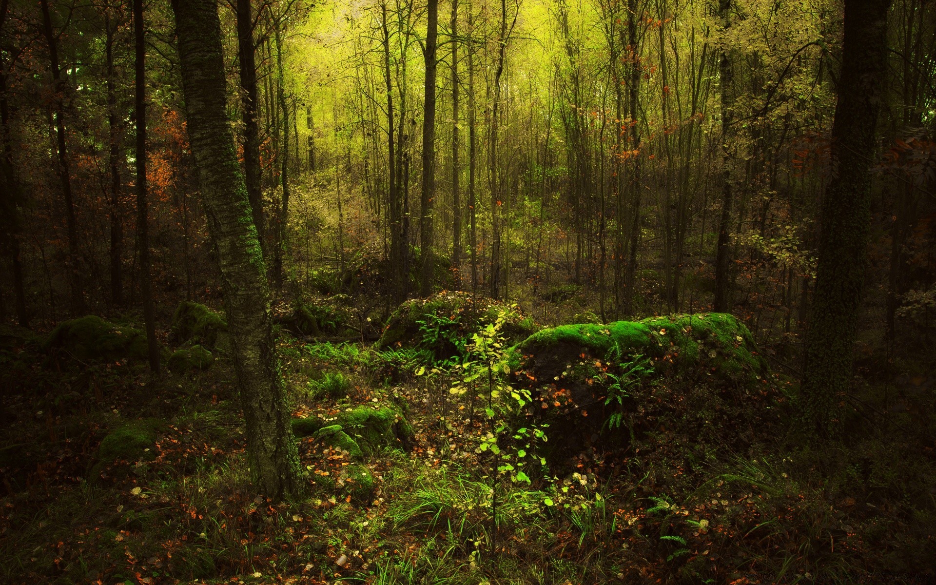 Hermoso paisaje en el bosque con musgo cubierto en el bosque