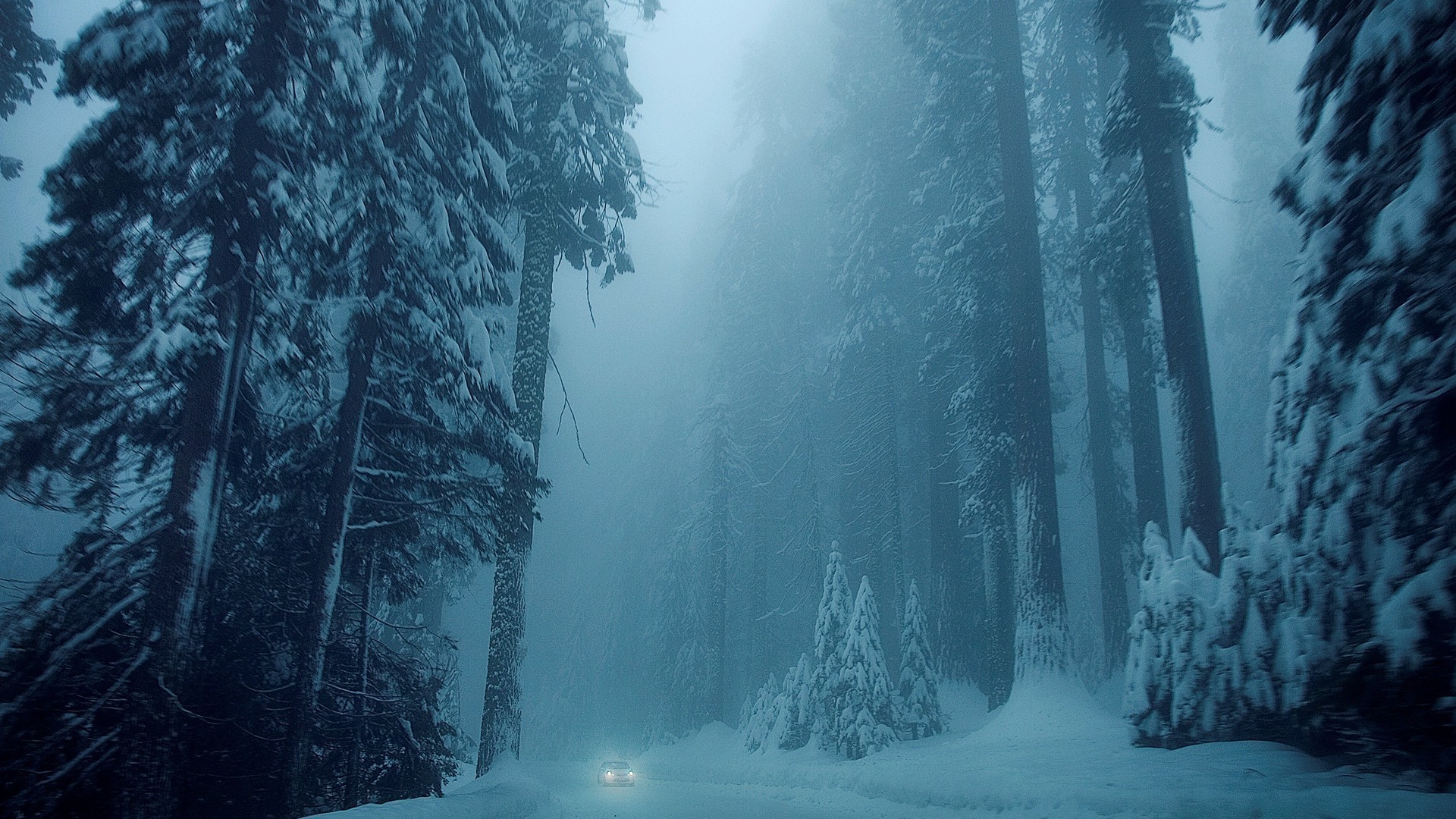 Camino de invierno, bosque en la niebla