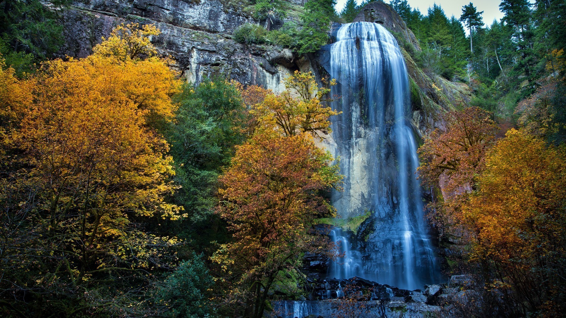 Gran cascada entre el follaje amarillo