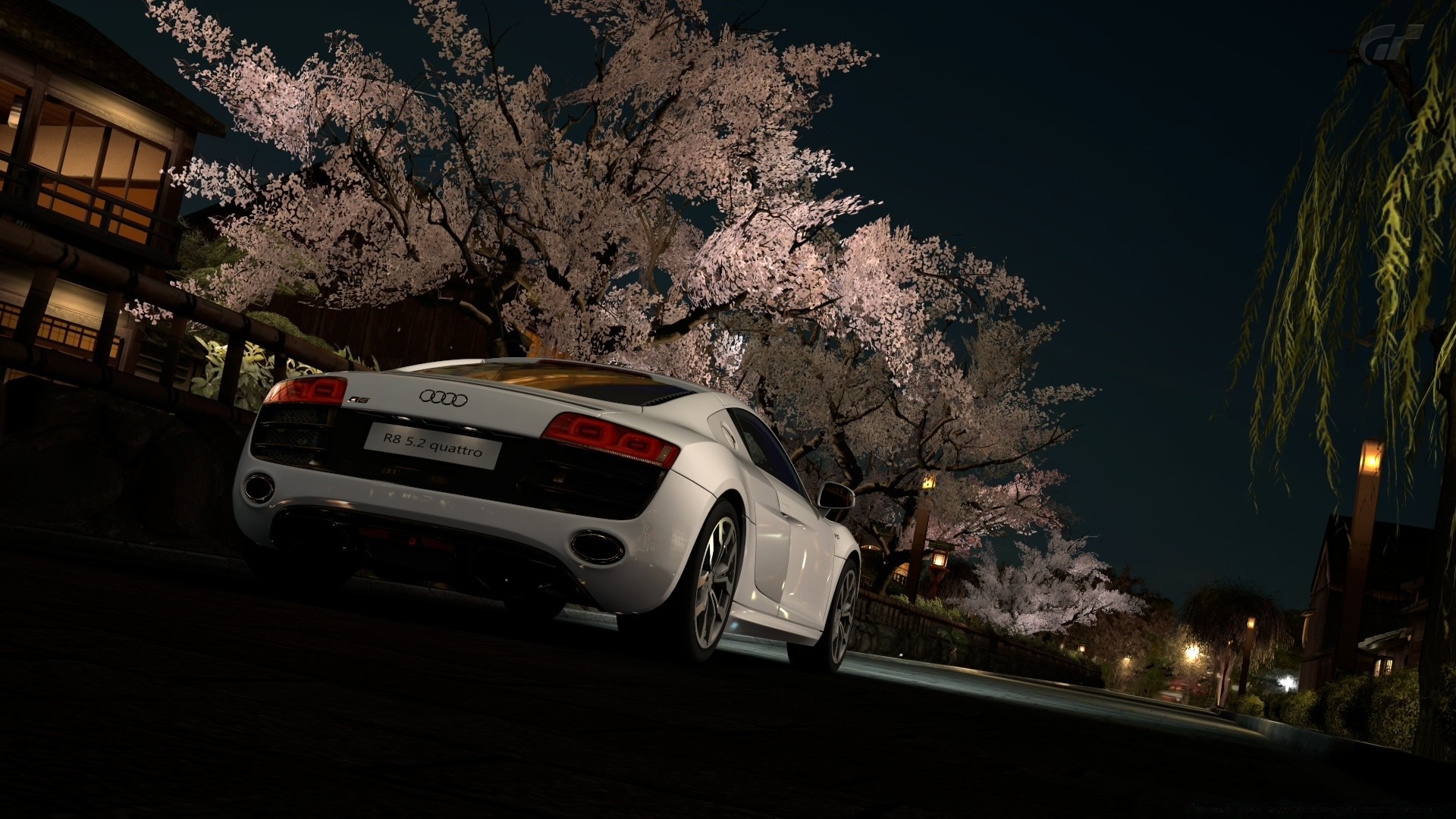 Coche púrpura, Sakura, pagoda y linternas chinas