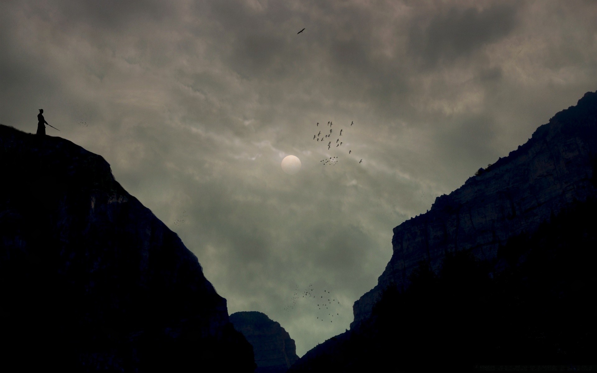 Guerrero Samurai con una espada de pie en una roca en el fondo de la Luna llena