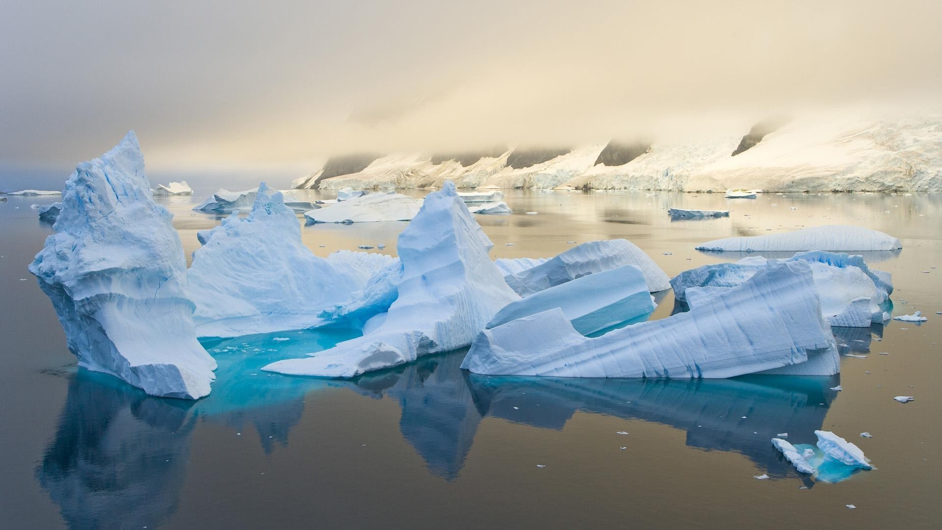 Oso en el fondo de las montañas nevadas y la superficie del agua