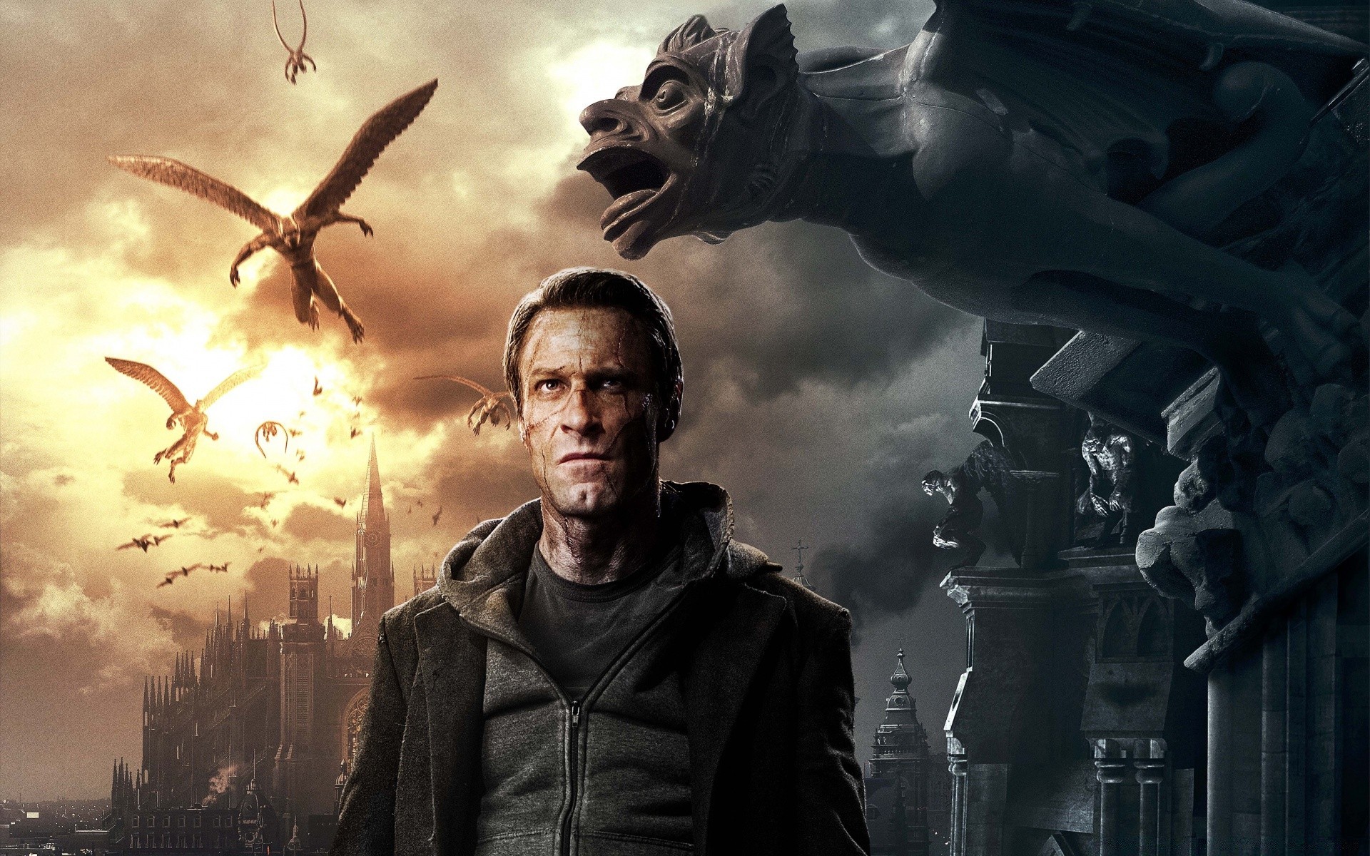 Hombre en una ciudad de miedo con dragones