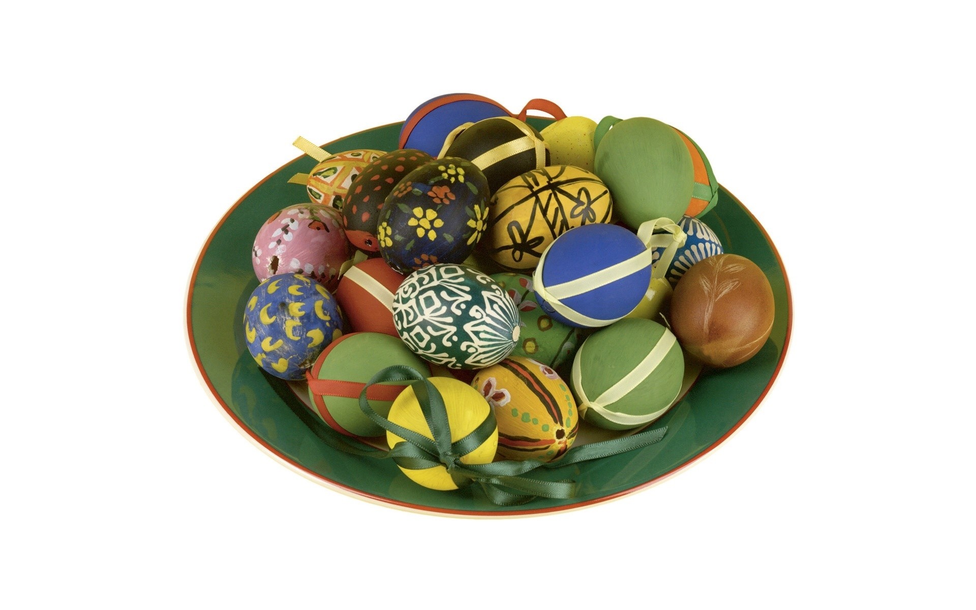 Lindo cachorro disfrazado de conejito de Pascua en una canasta con huevos pintados. Pascua