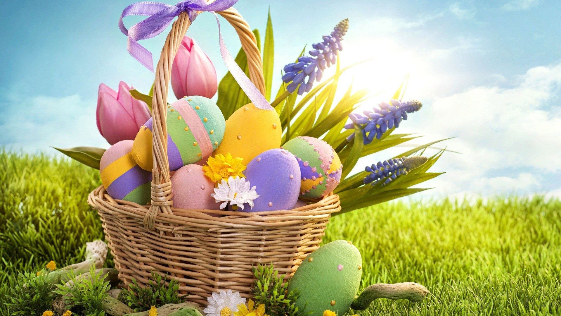 Cesta con huevos pintados y flores