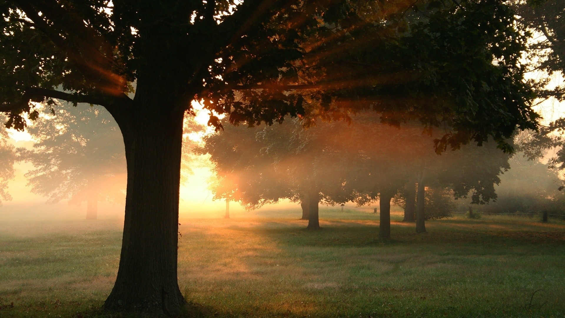 Detrás de un lago enfermo en el bosque iluminado por los rayos del sol