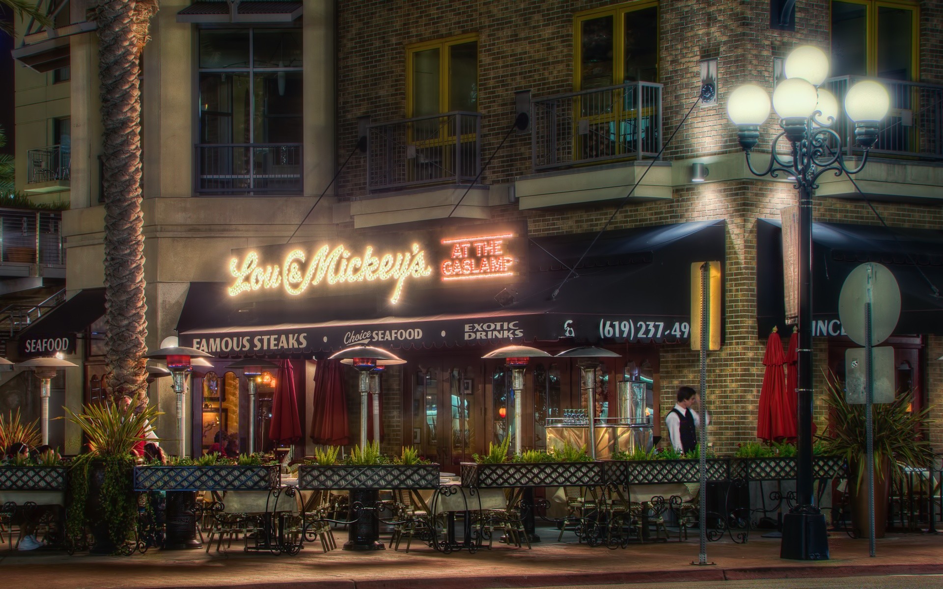 Restaurante Steakhouse Lou & Micky en la noche, San Diego, CA