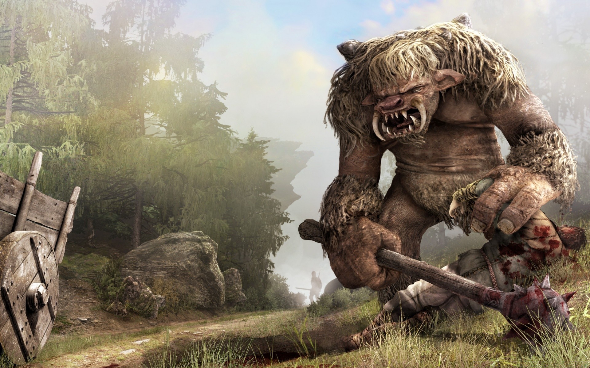 Imagen de un juego de ordenador con la imagen de un gigante con un martillo