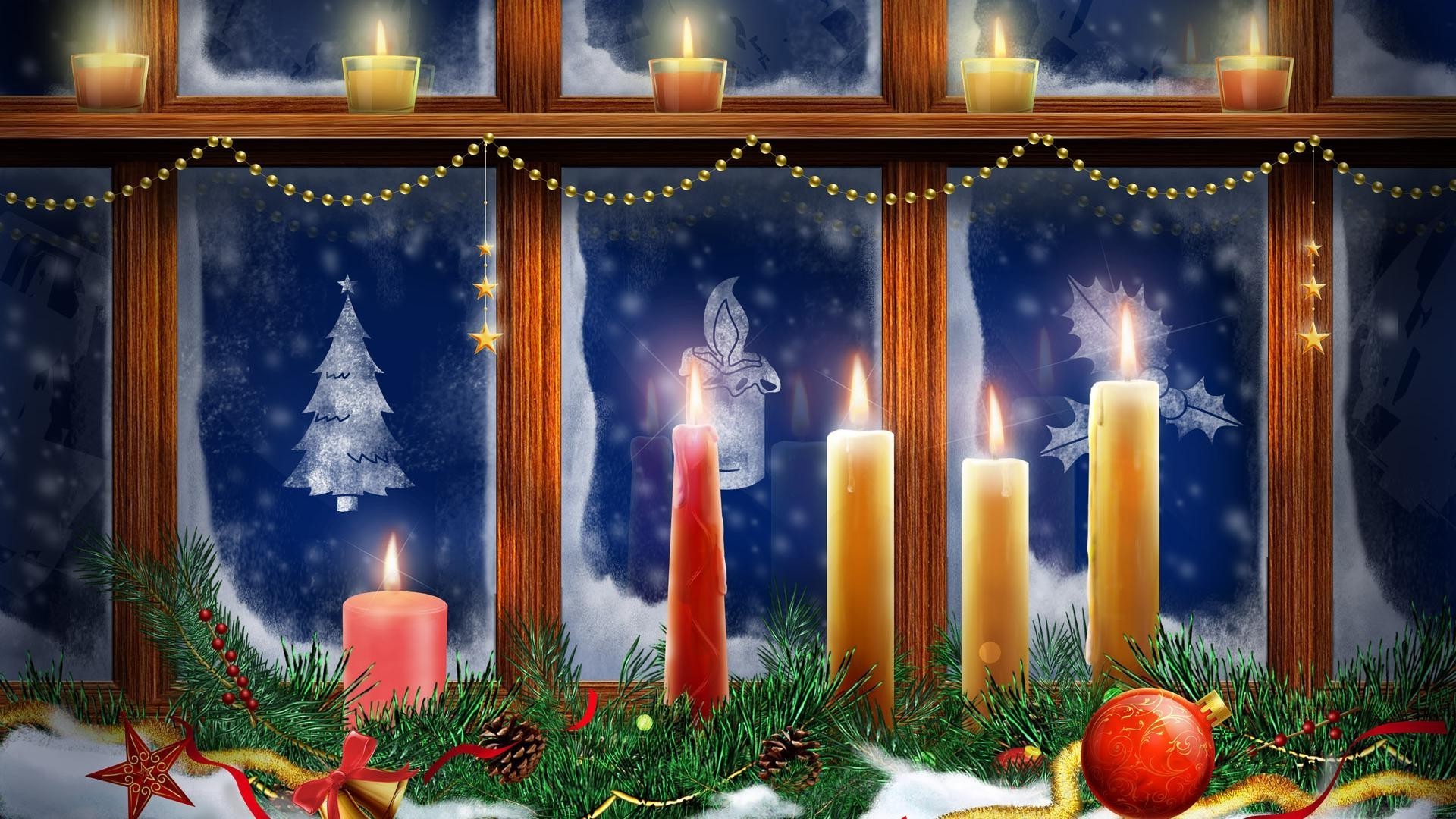 Imagen de año nuevo de velas encendidas en una ventana congelada