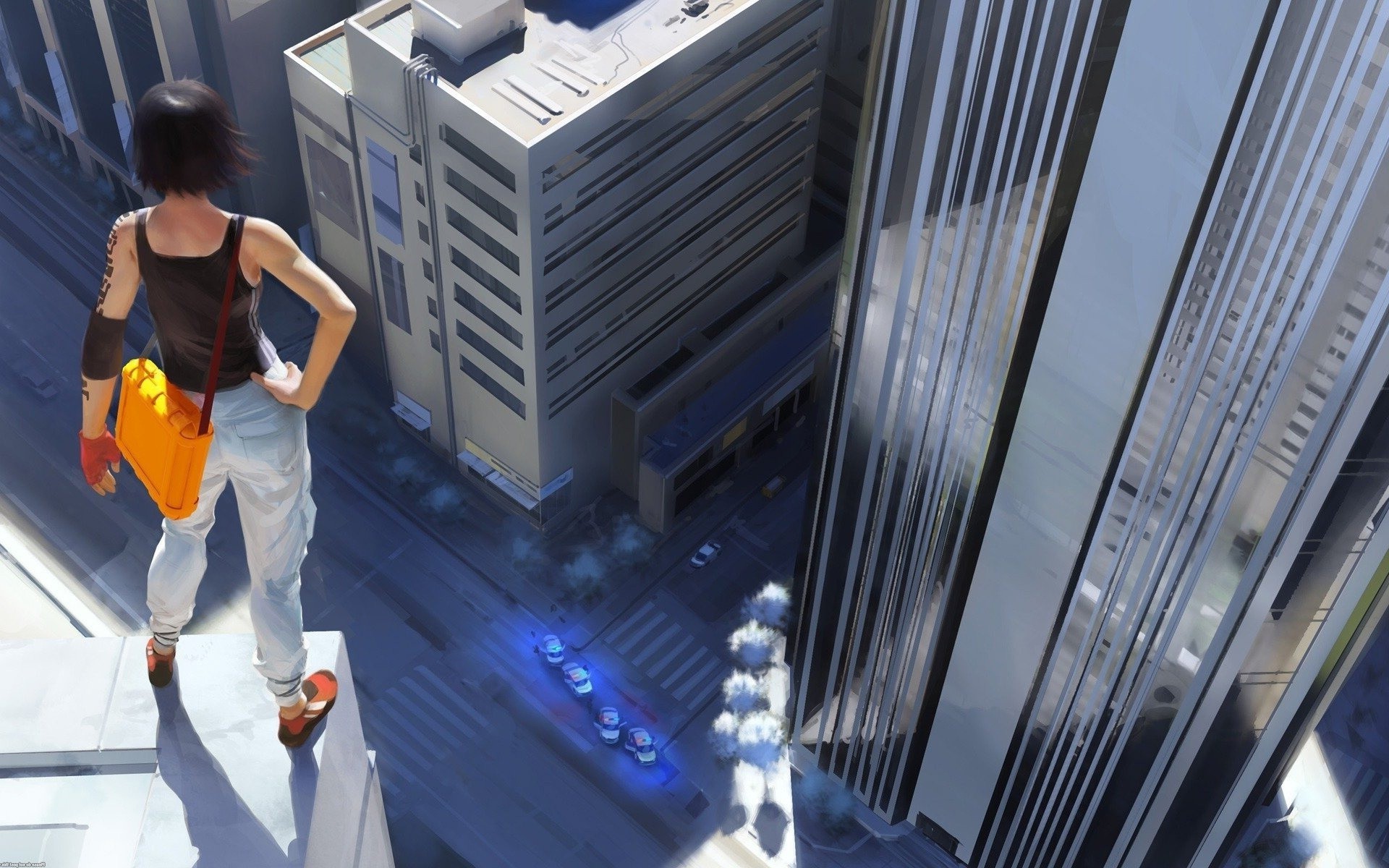 La chica Tracer está de pie en el borde del techo de un rascacielos