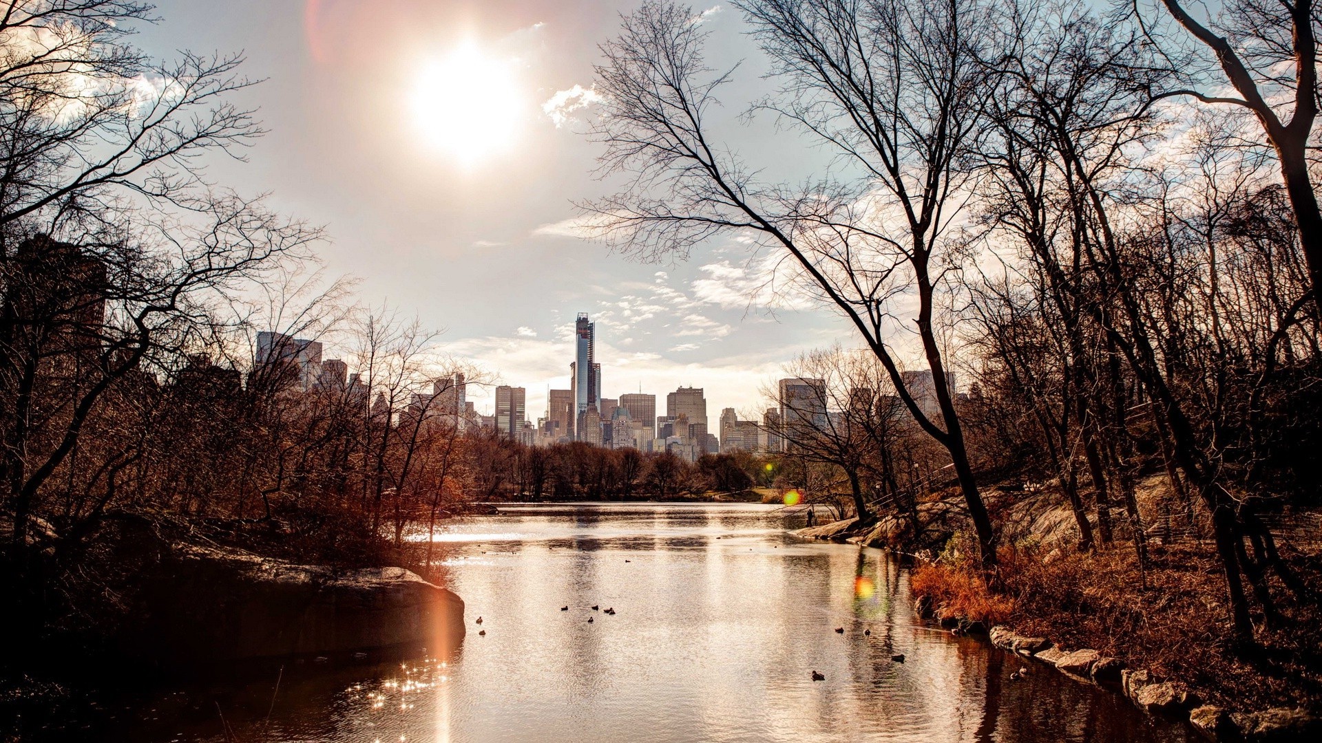 Un parque con un lago en una gran ciudad