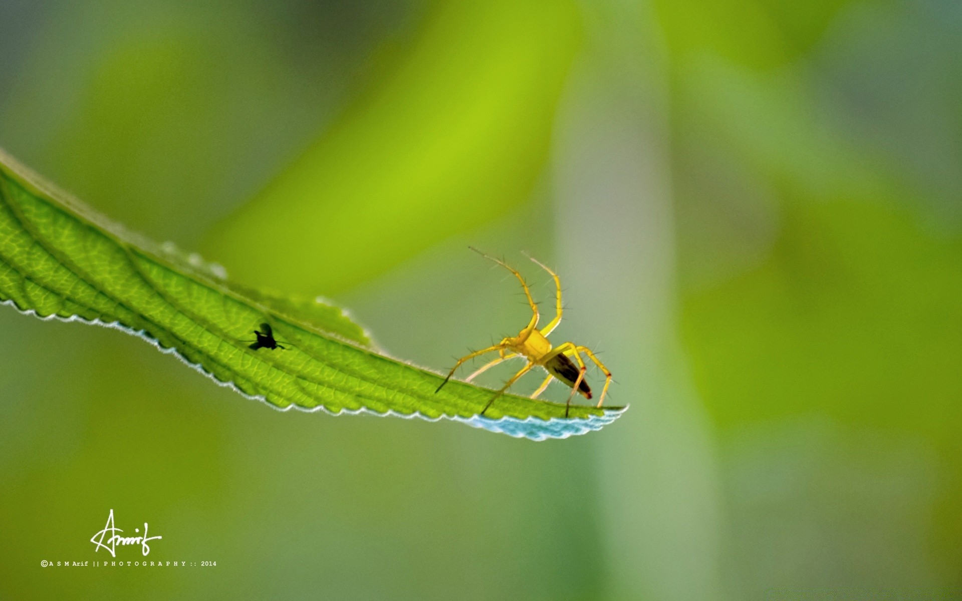 Una araña se arrastra detrás de un insecto en una hoja
