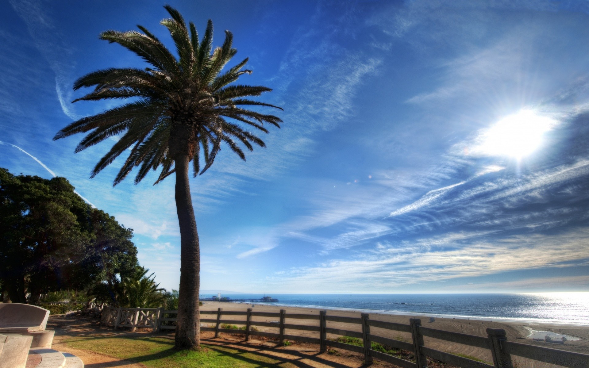 Una palmera inclinada contra una playa de arena
