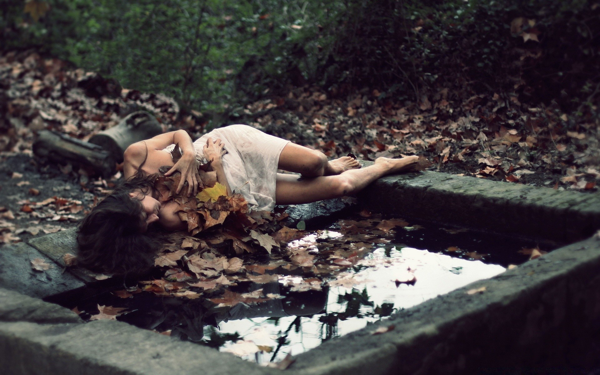 Una niña en un camisón se encuentra en el borde de la piscina y se refugió en las hojas caídas