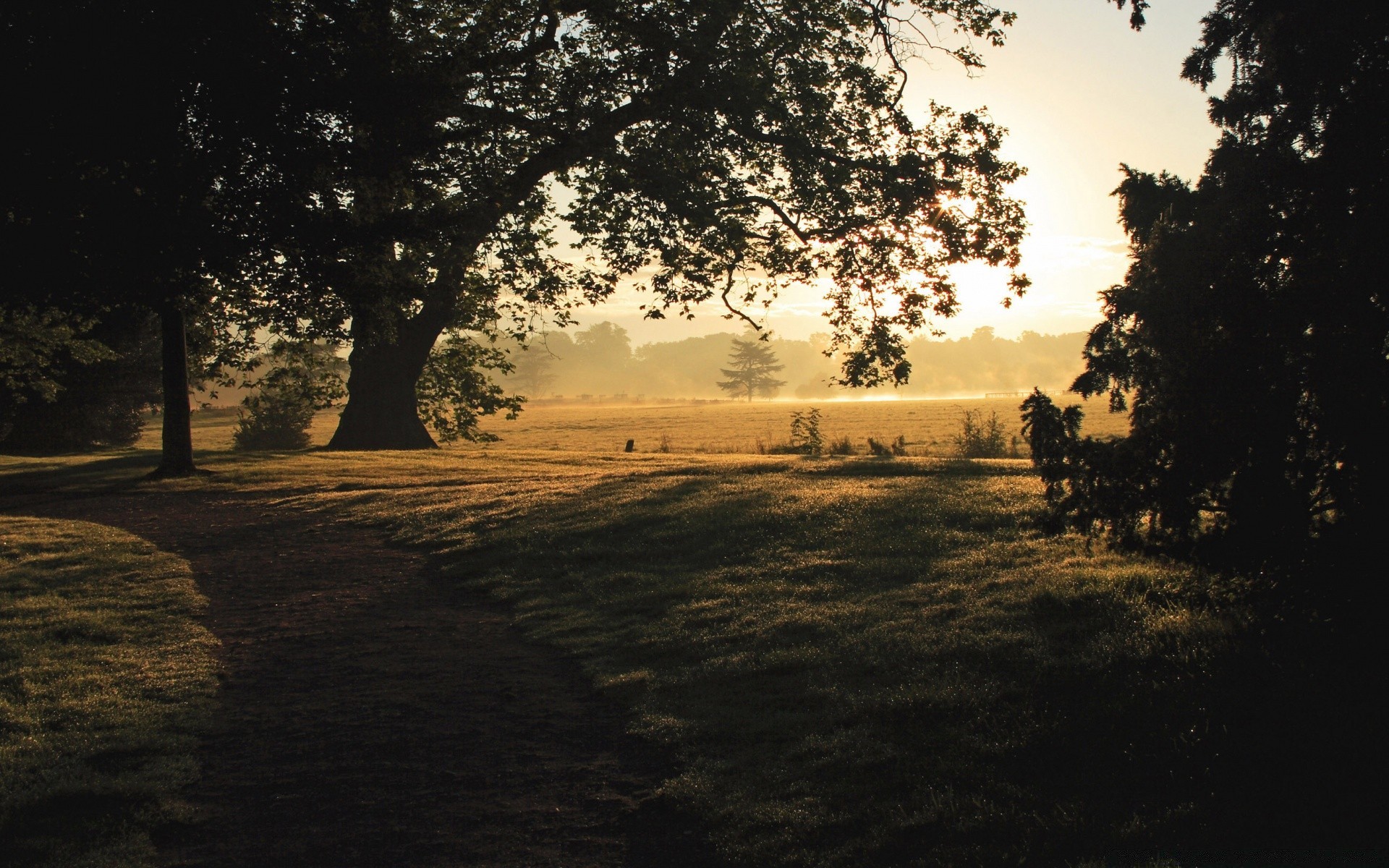 Un paisaje brumoso y misterioso con campos y un sol suave
