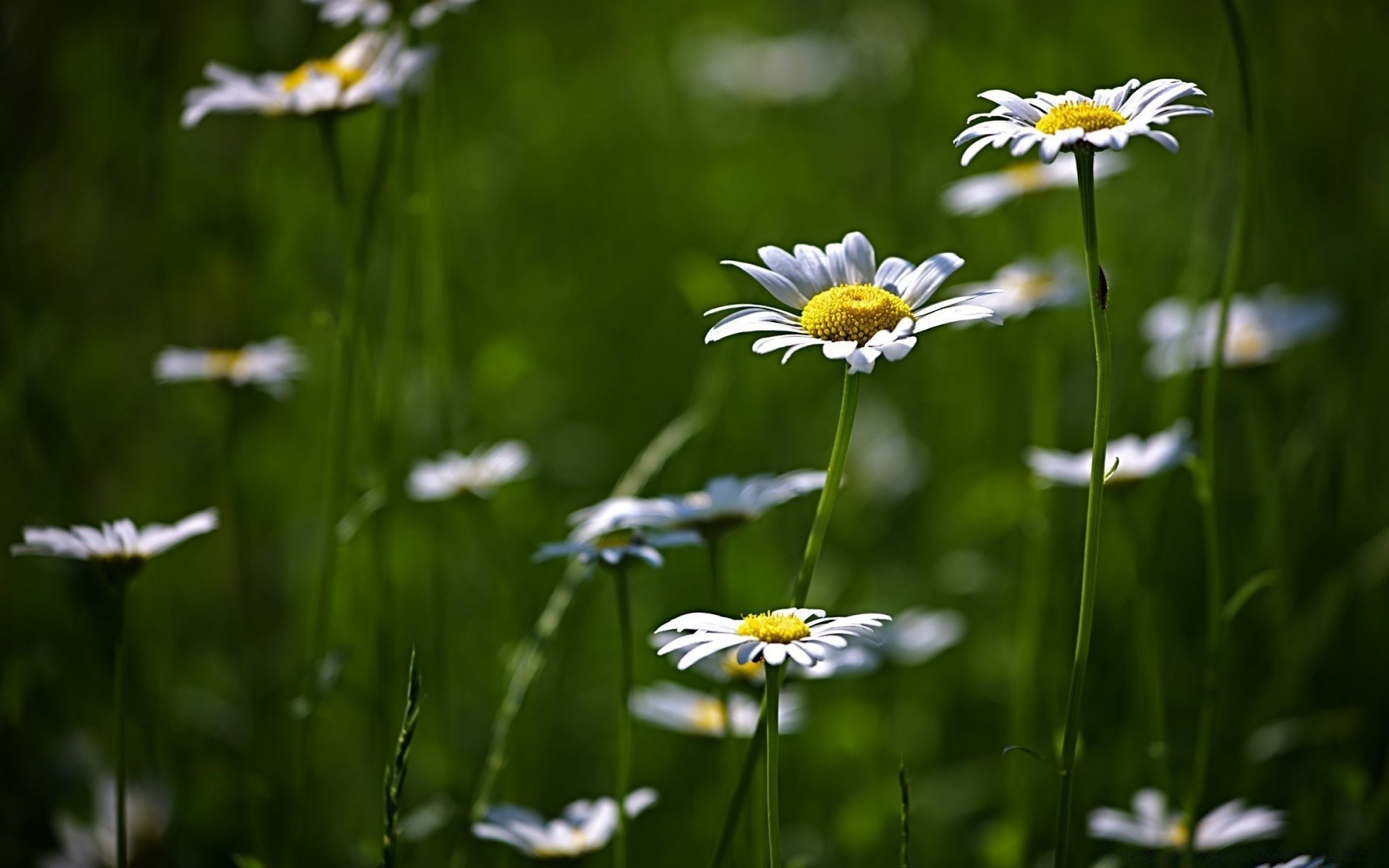 Las margaritas entre la hierba verde crecen