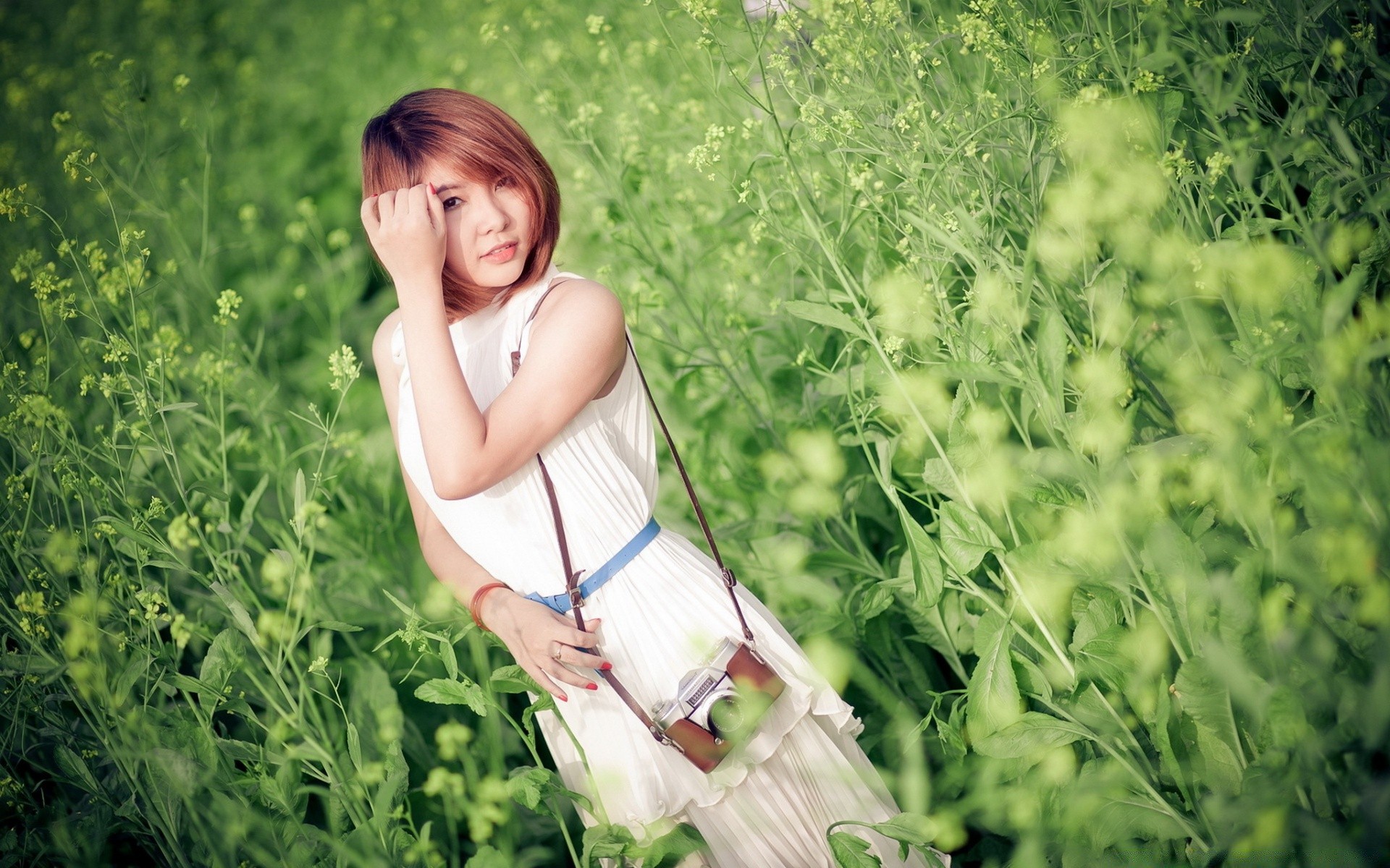 Chica en el campo en la hierba con una cámara