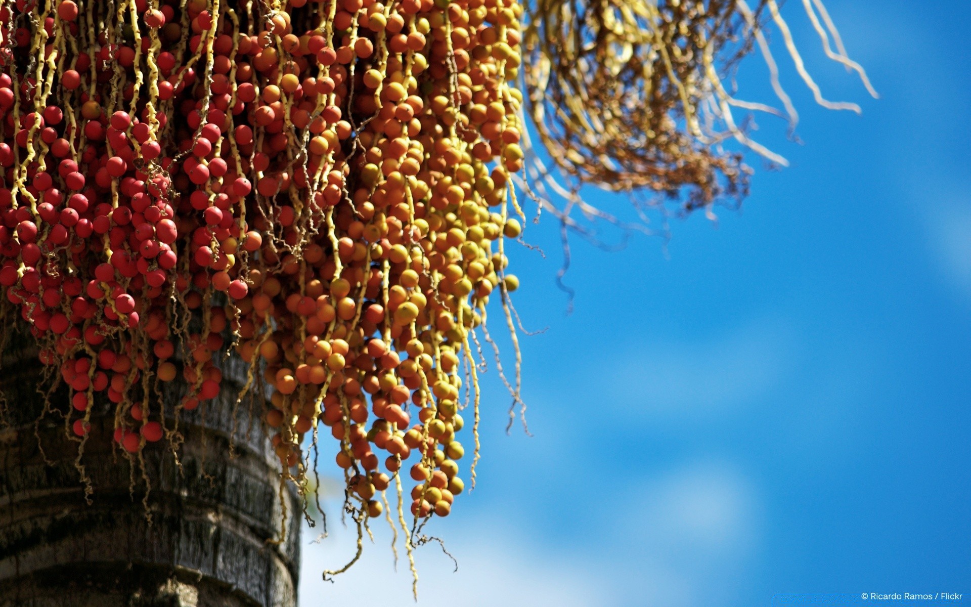 Los frutos de la fruta colgando en las ramas contra el cielo