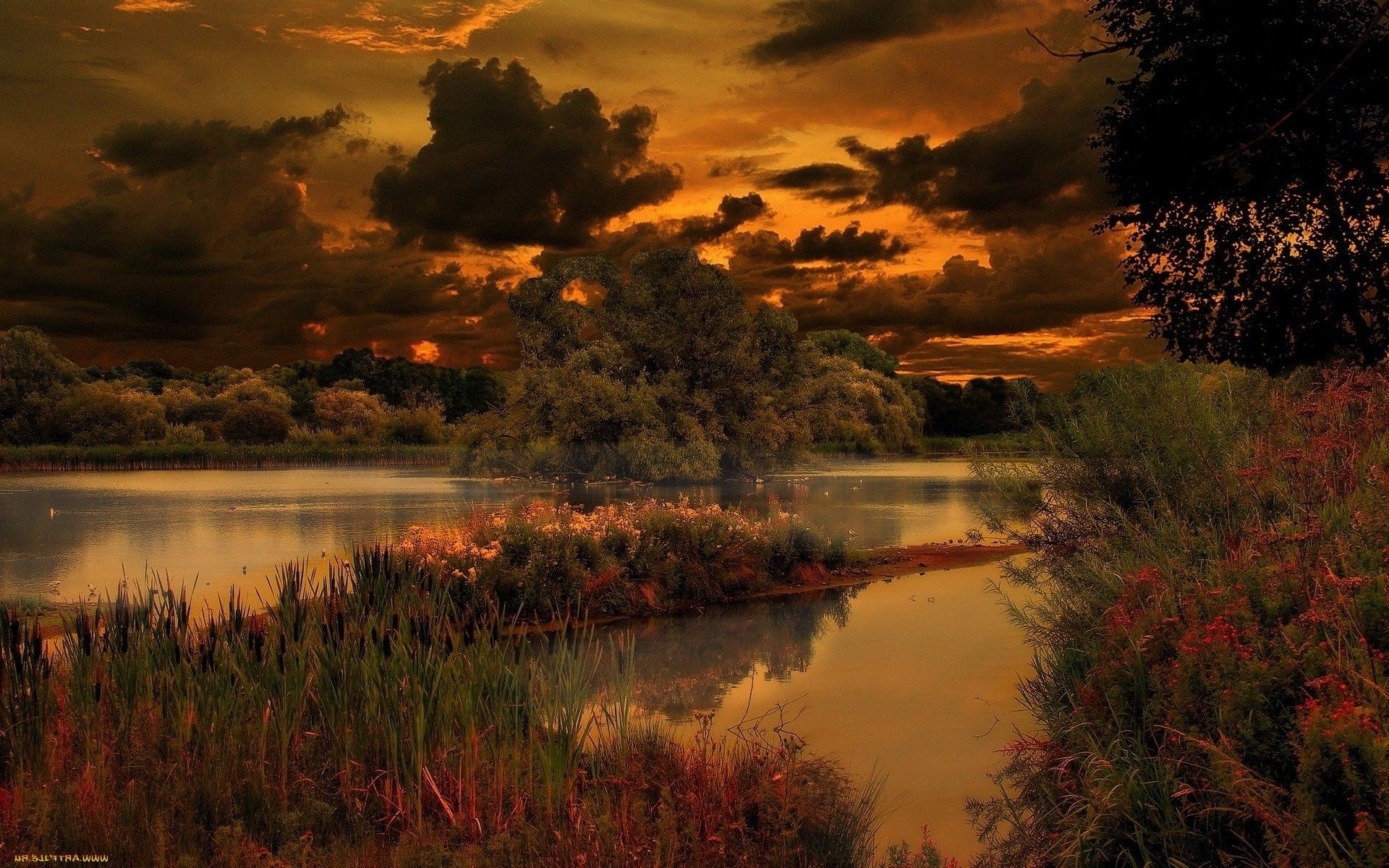 Puesta de sol de otoño en el lago entre los árbolesPuesta de sol de otoño en el lago entre los árboles