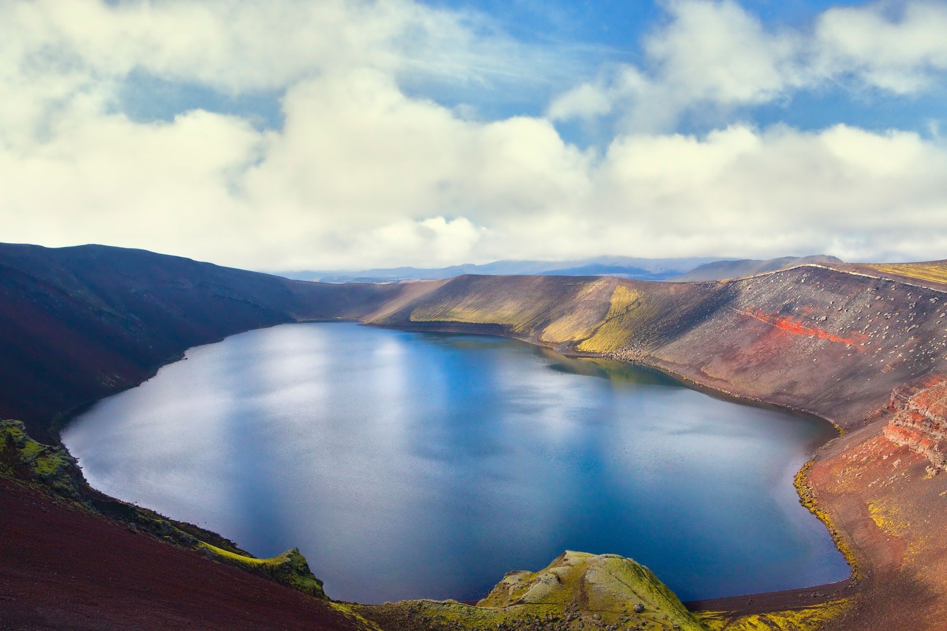 La puesta de sol ilumina la superficie del lago, la costa se refleja en el agua oscura