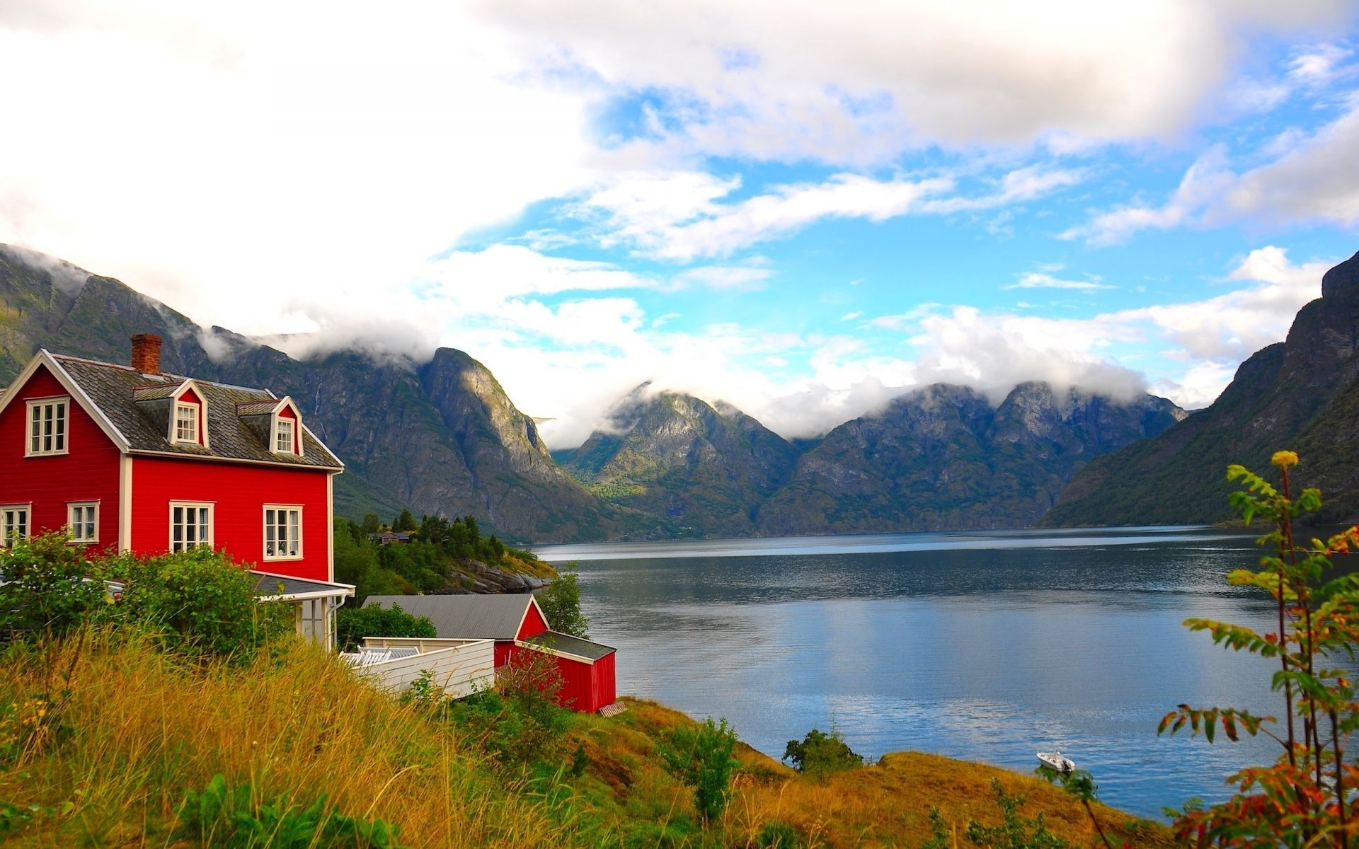 Cielo nubes casa naturaleza barco lago paisaje montaña