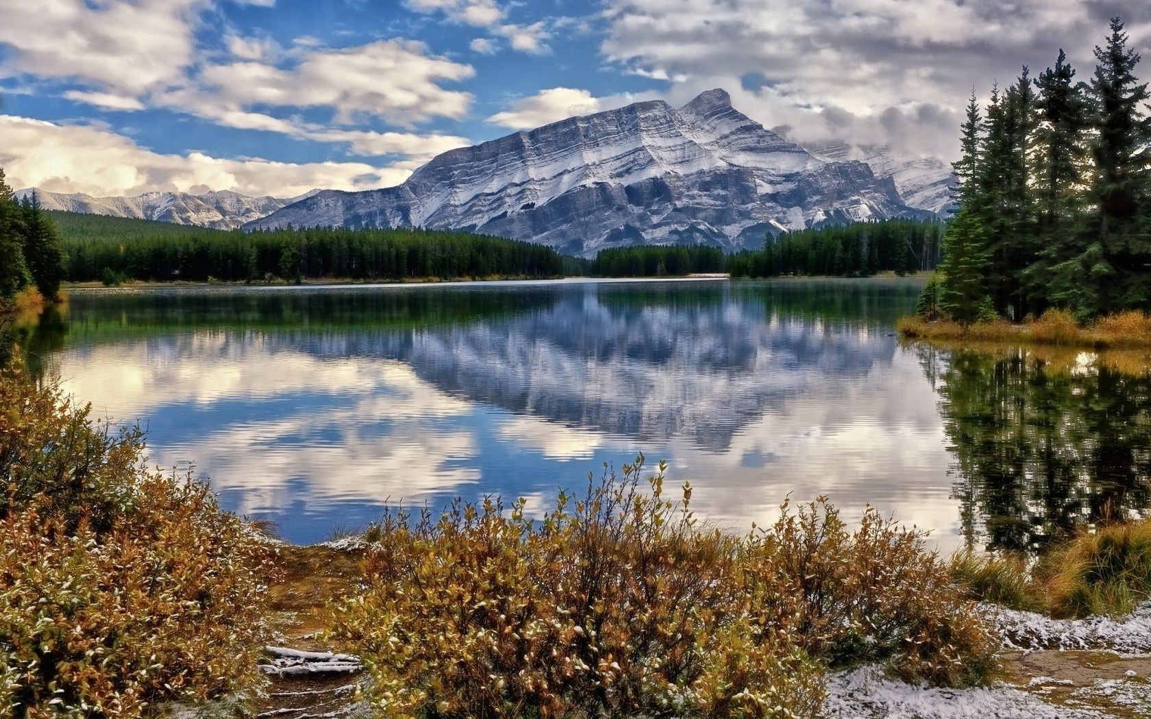 Paisaje pintado. Barco en el lago y caída de hojas de otoño