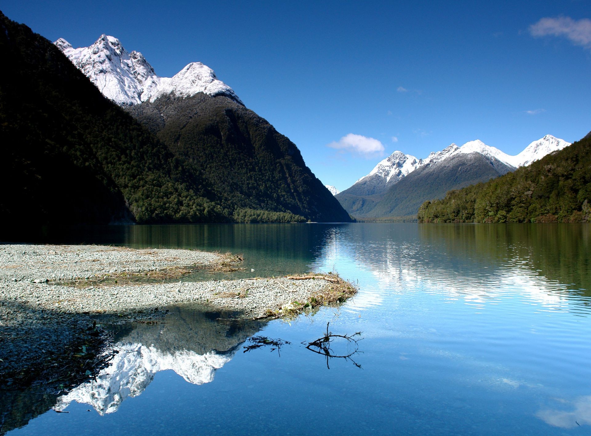 Lago entre verdes colinas. Cielo azul y nubes blancas