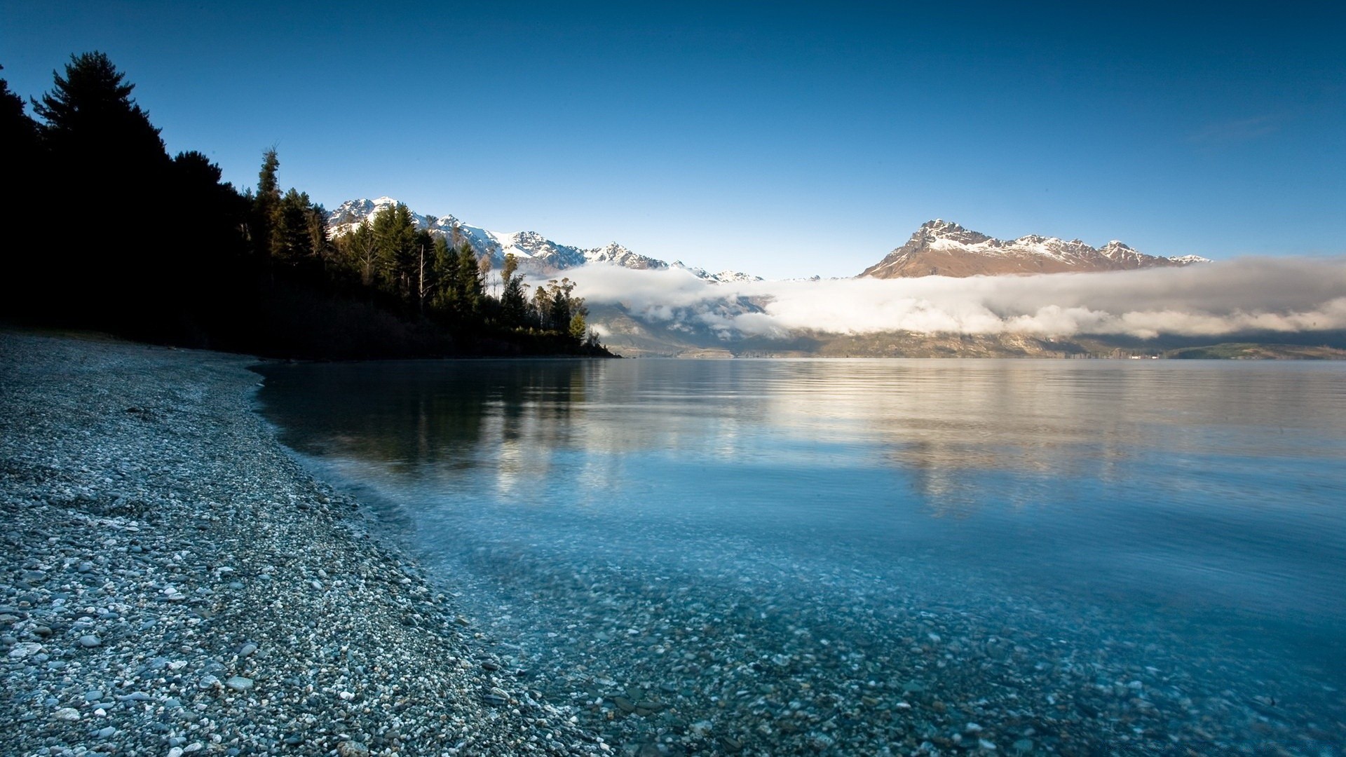 Las montañas cubiertas de nieve se reflejan en el agua del lago