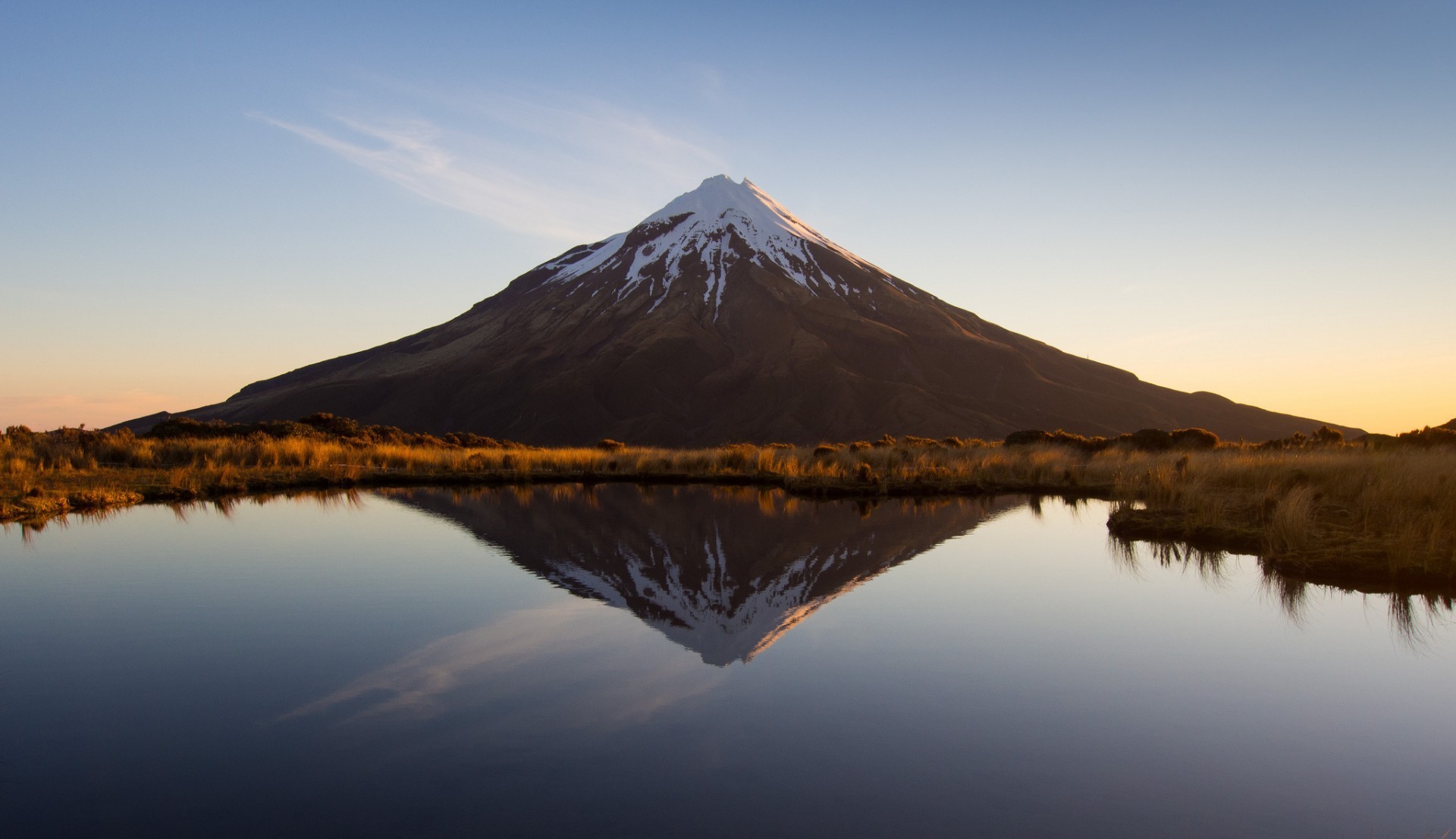 Reflejo de un volcán en un lago de cristal