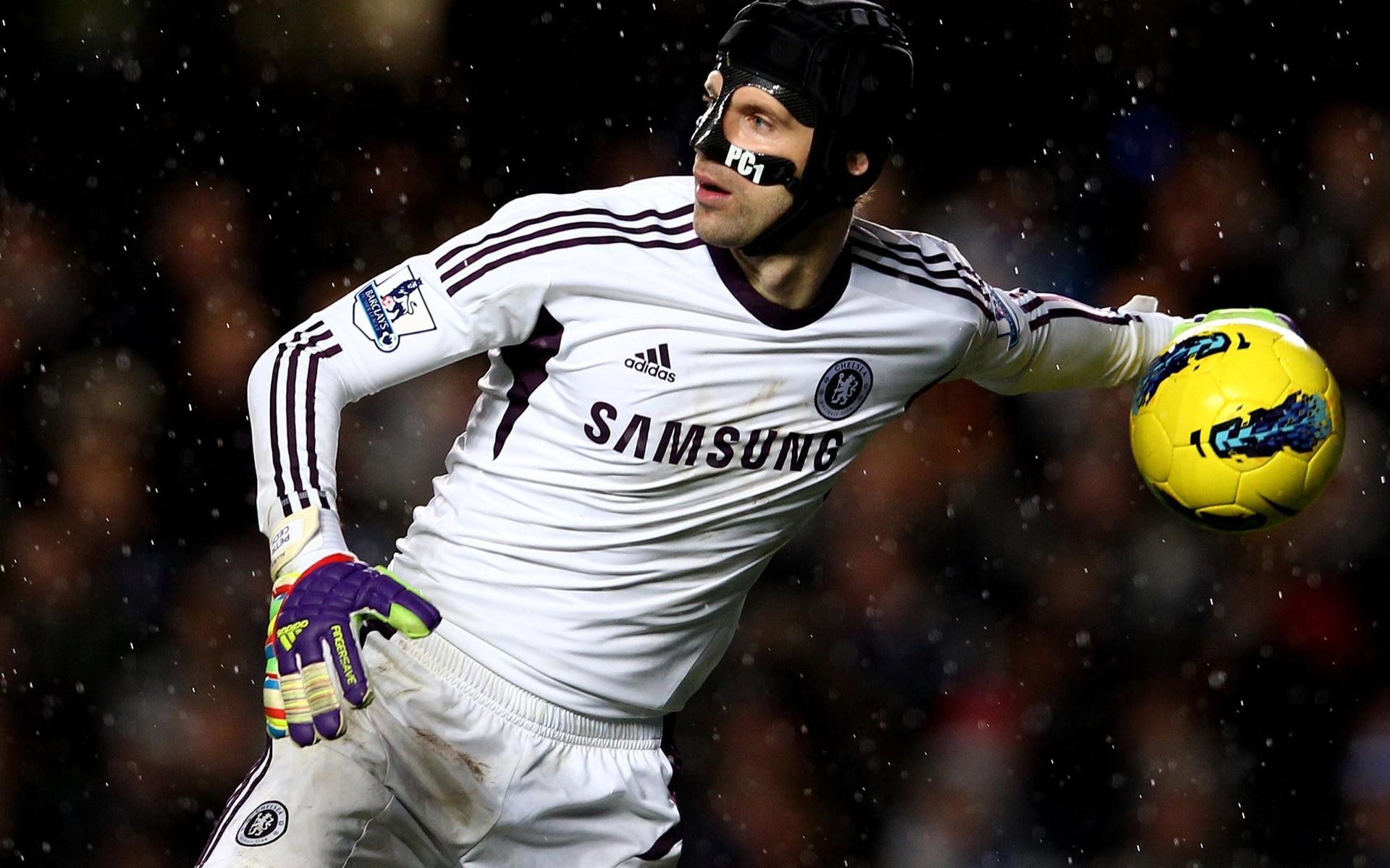 Futbolista con el balón bajo la lluvia