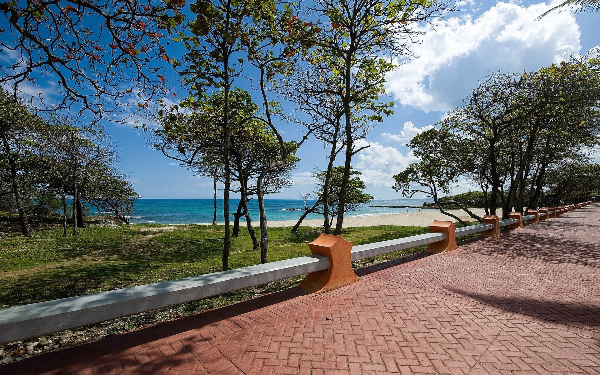 Árboles verdes a lo largo de los adoquines