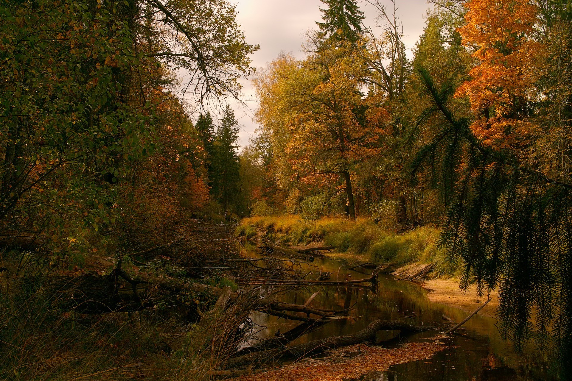 Hermoso estanque en el fondo de una puesta de sol de otoño entre los árboles