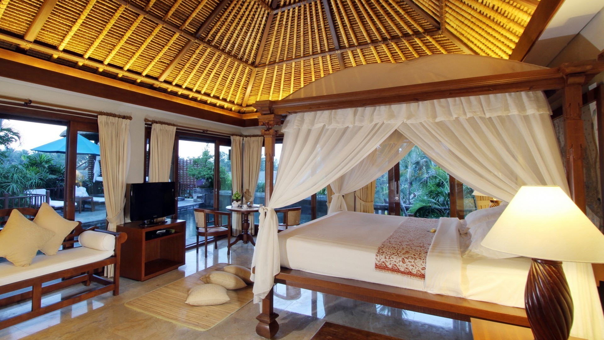 Vista desde el balcón a la elegante piscina de agua azulVista desde el balcón a la elegante piscina de agua azul