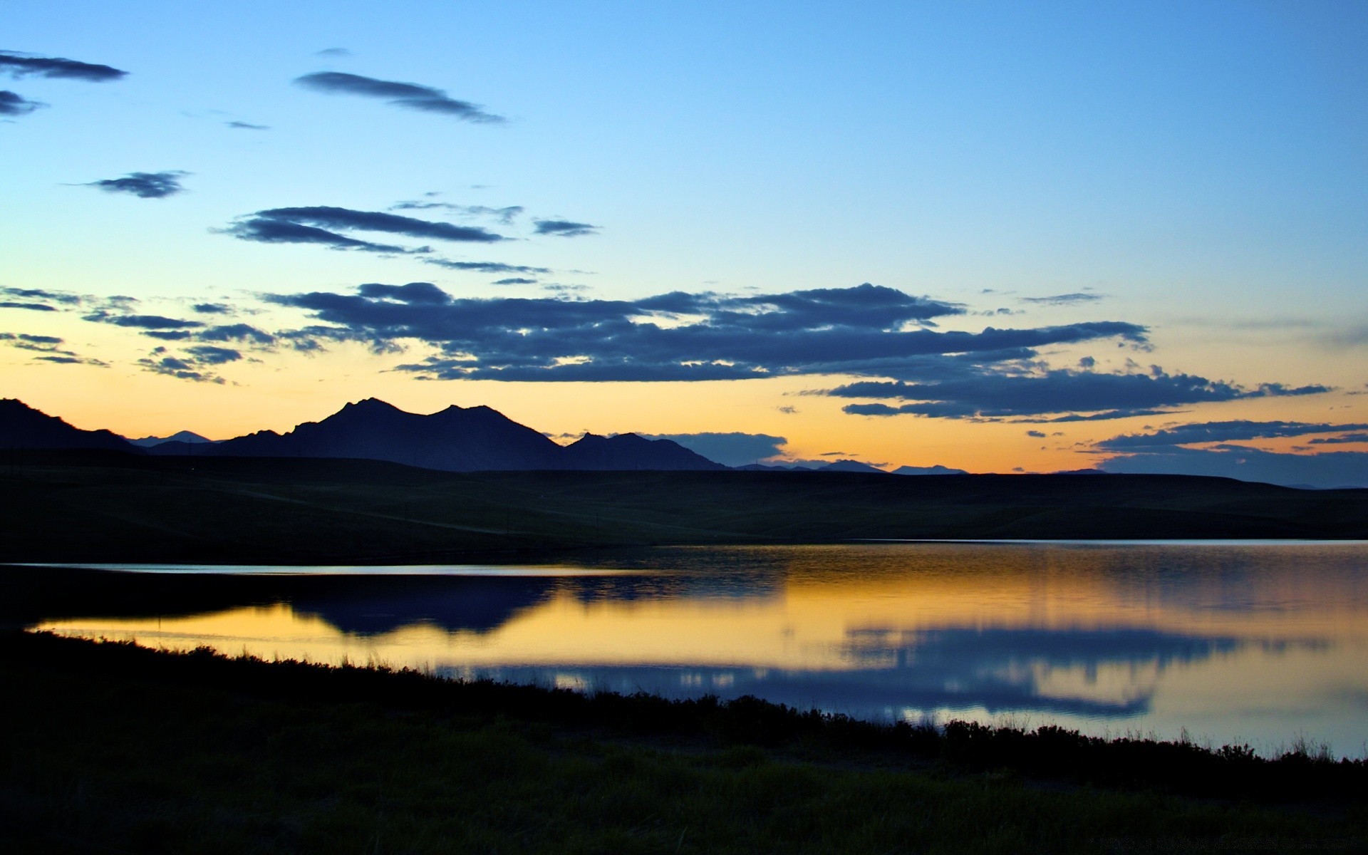 Paisaje con puesta de sol y cuerpo de agua por la noche