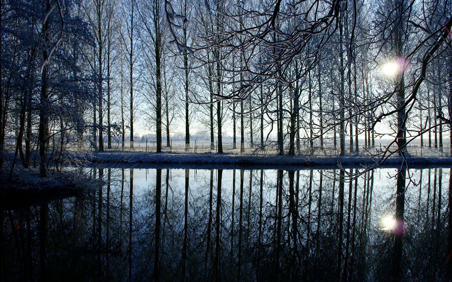 Reflejo del sol a través de los árboles en el estanqueReflejo del sol a través de los árboles en el estanque