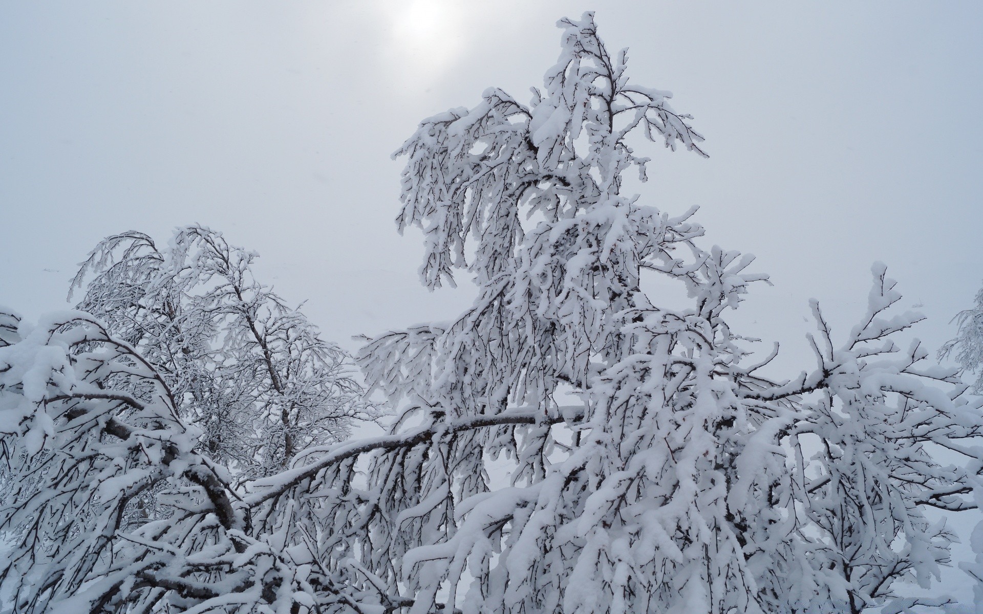 Rama de árbol de Navidad cubierto de nieve con bolas de Navidad azules