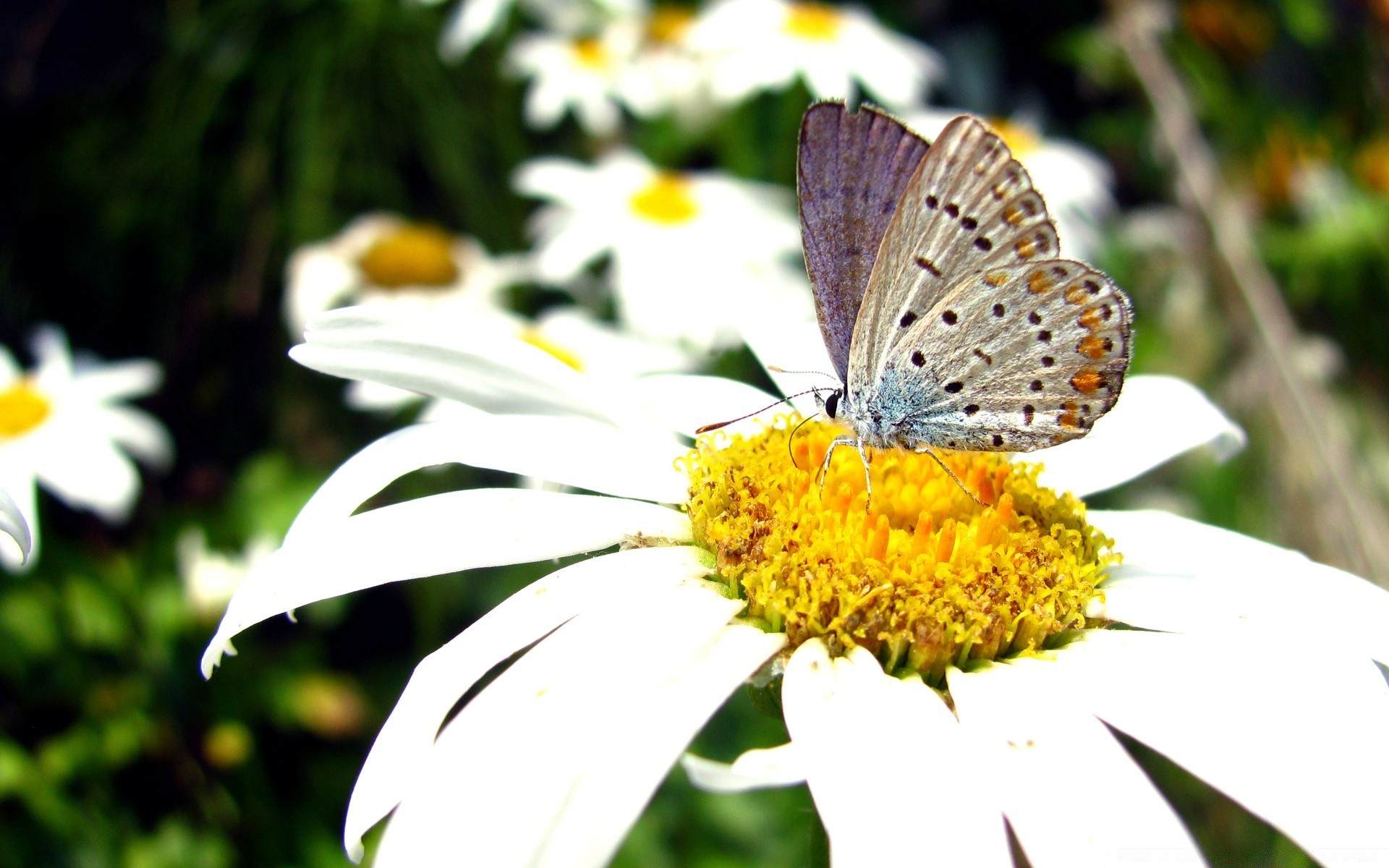 Mariposa de colores se agachó en una margarita brillanteMariposa de colores se agachó en una Margarita brillante