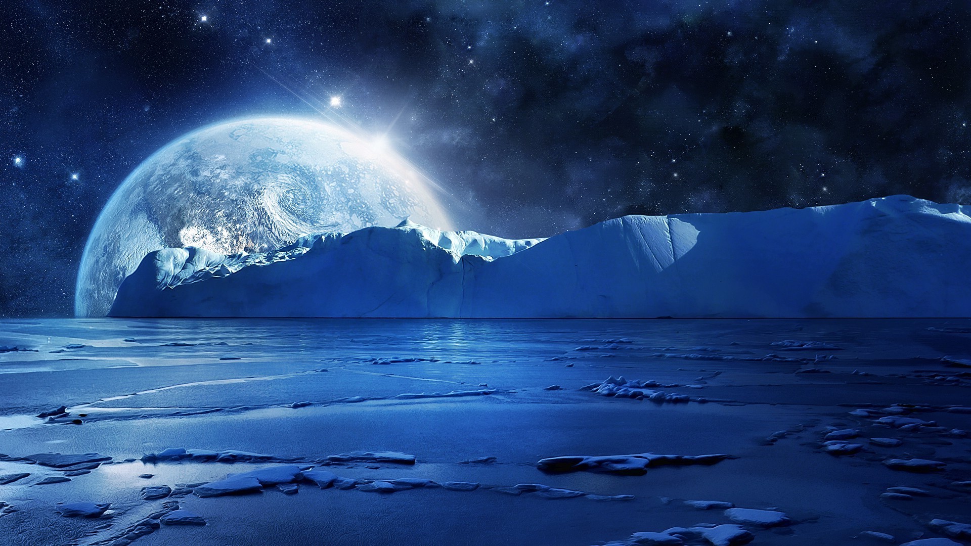 Paisaje cósmico, lunas y planetas en el fondo del cielo estrellado