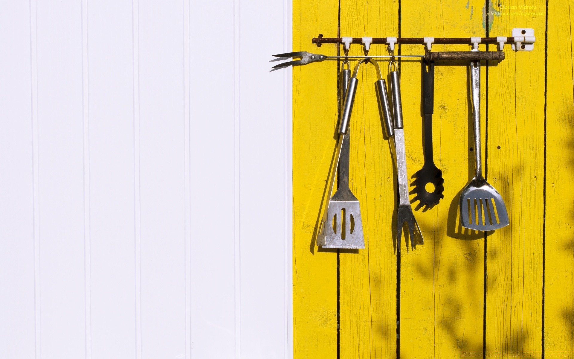 Juego de cubiertos colgando de la madera
