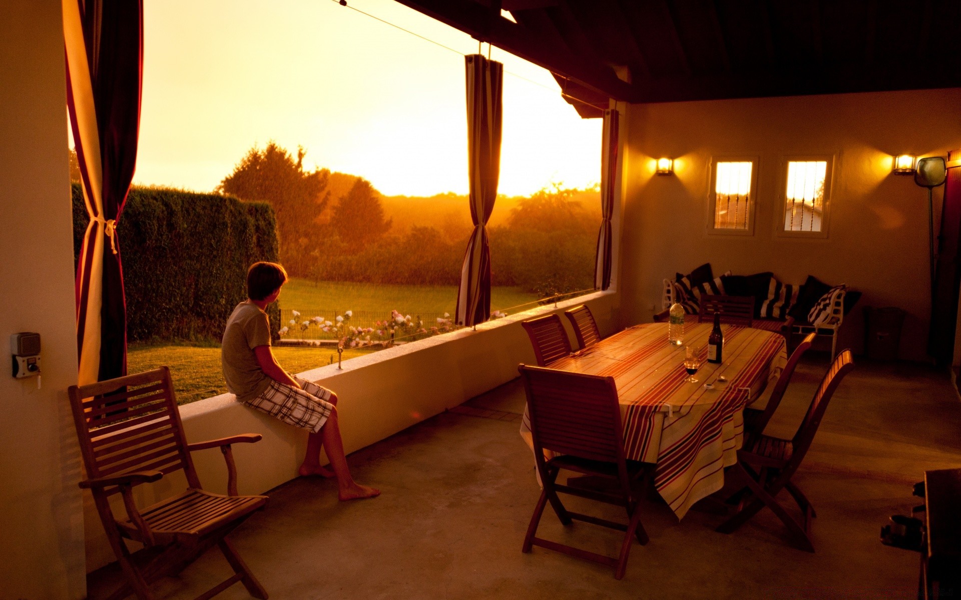 Playa de vacaciones con árboles tropicales en el fondo de la puesta de sol