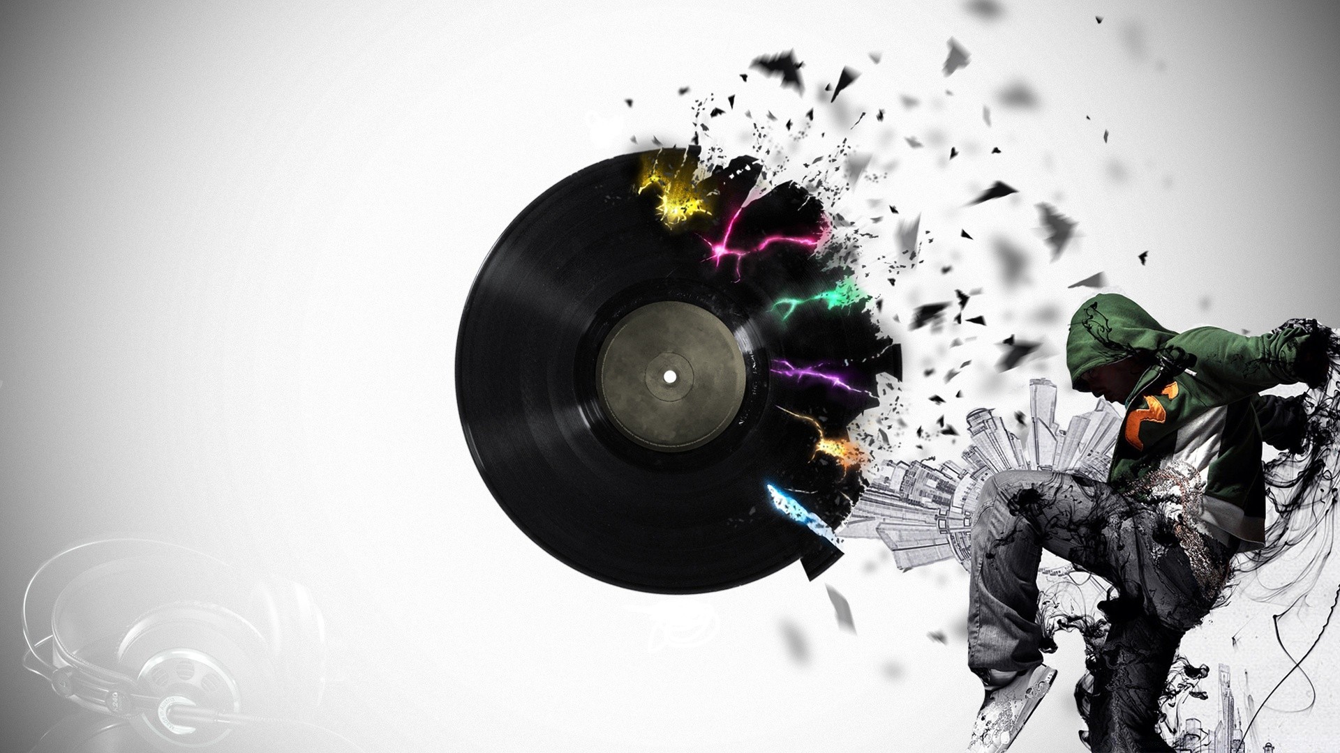 Un fondo creativo con un hombre bailando y un disco de vinilo