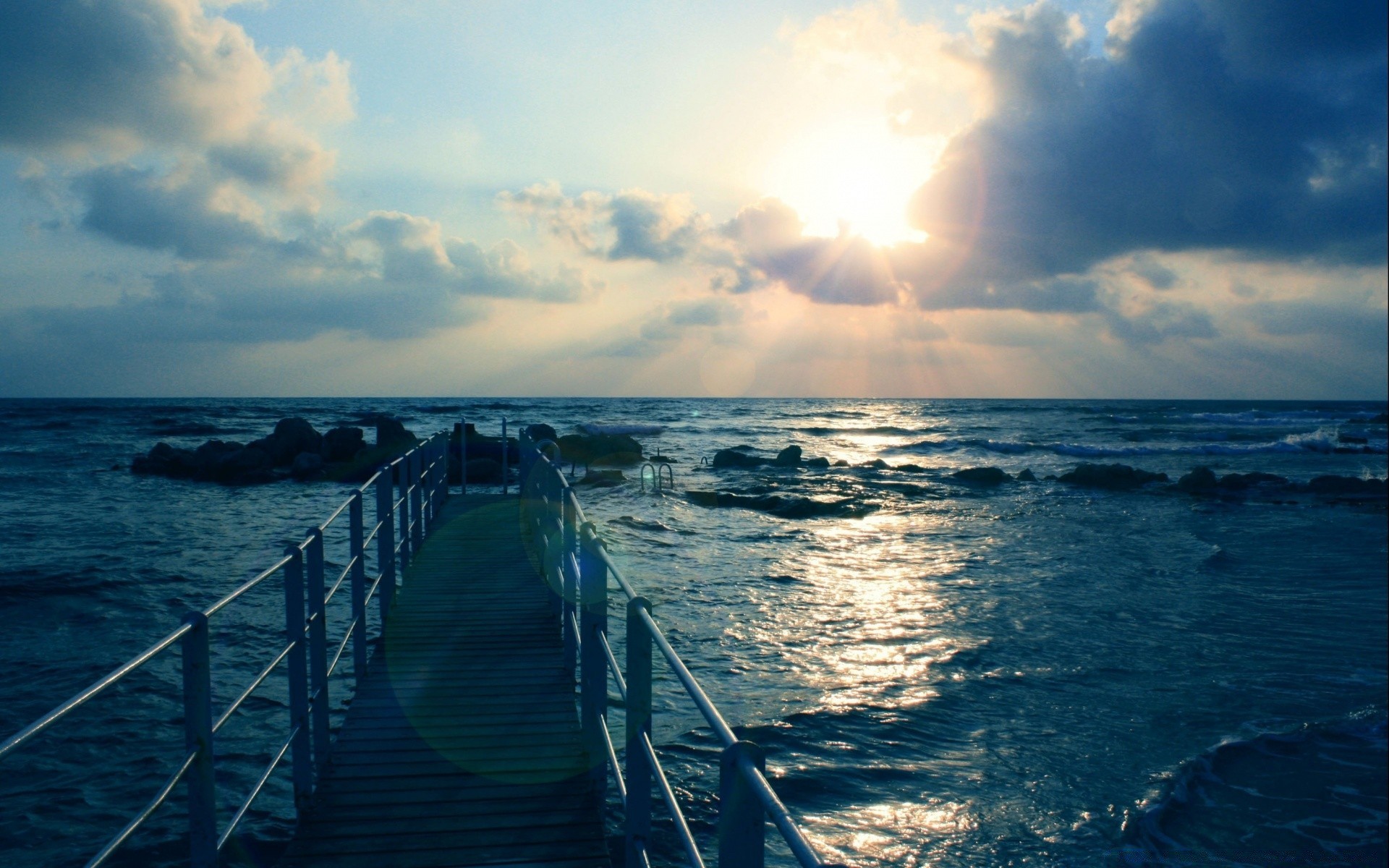 Puesta de sol junto al mar en tonos naranjas, muelle
